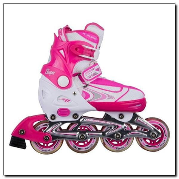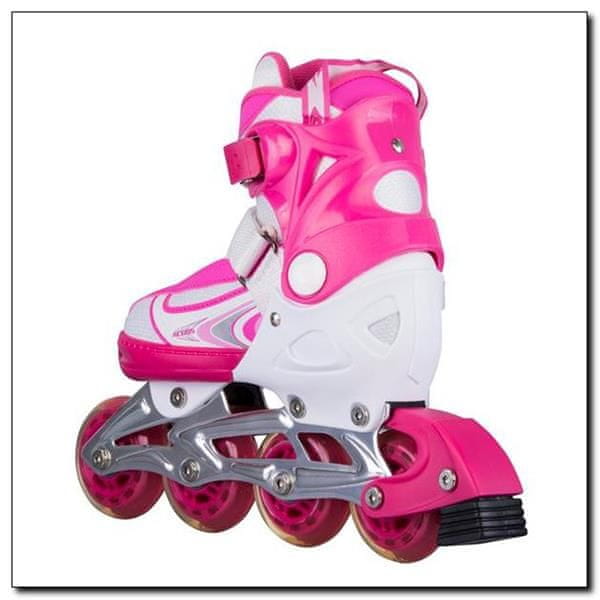 PW-126B so rolerji, namenjeni najmlajšim ljubiteljem drsanja. Izdelek je kombinacija zanimivega dizajna in visoke kakovosti izdelave. Lahek in trpežen čevelj s sistemom trakov (velcro, dvodelna zaponka) zagotavlja maksimalno varnost. S preprostim sistemom prilagajanja lahko enostavno in hitro prilagodite velikost nogi uporabnika. Roler je opremljen s posebnim aluminijastim okvirjem in ležaji ABEC5. Model je na voljo v treh barvnih različicah. Tehnični podatki Ogrodje rolerjev: aluminij Ležaji: ABEC 5 Kolesa: 64 mm/ 72 mm/ 76 mm* PU čevelj: pol mehak Zapenjanje: dvodelna zaponka Zavezovanje s trakom Velcro Rolerji opremljeni z zavoro Barva: roza, črna, rdeča Velikosti: Roza: XS(29–32) S(33–36) M(37–40) Črna: S(33–36) M(37–40) L(40–43) Rdeča: XS(29–32) S(33–36) M(37–40) L(40–43) Opombe Garancija 24 mesecev