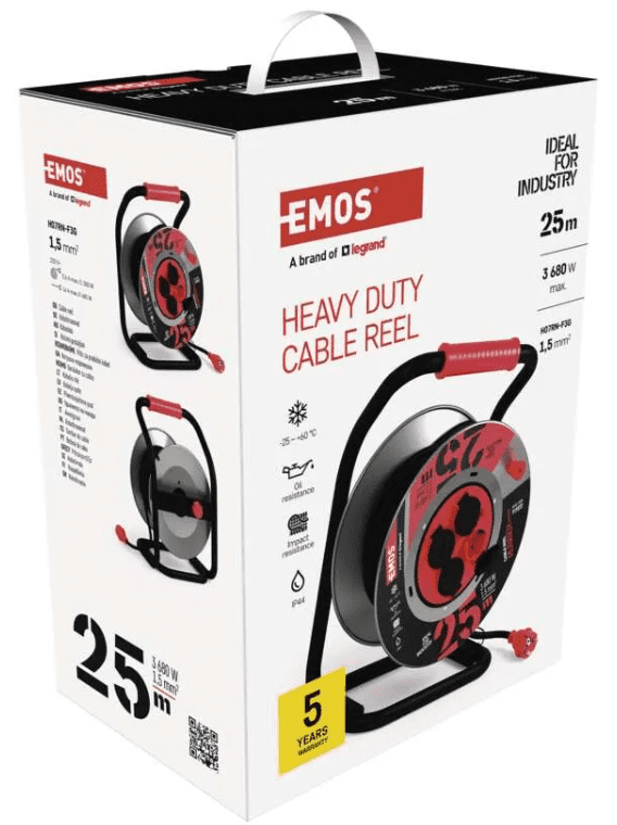 Ta kolutni podaljšek je odlična izbira za uporabnike, ki potrebujejo prilagodljivo rešitev za zunanjo uporabo. Odlikujejo ga dolga življenjska doba, odporen material in preprosta uporaba. S 25 metri dolžine nudi dovolj svobode pri razporejanju električne opreme, hkrati pa ohranja kompaktno obliko in organiziranost.