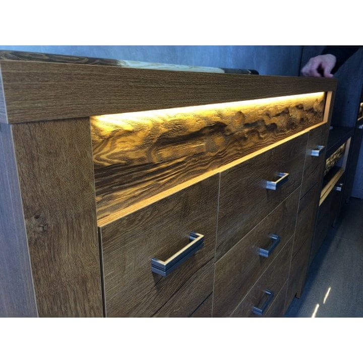 Barska omarica INFINITY 08 je dvovratna omarica s šankom in tremi predali, ki jo lahko kombinirate z ostalimi elementi iz modelne linije Infinity. Za barsko omarico je možno naročiti LED osvetlitev. Sistem Infinity je razkošen visokokakovosten sektorski sklop v masivni izvedbi z elementi iz surovega barvanega lesa z izrazitim reliefnim vzorcem. Posamezne elemente lahko uporabimo za opremljanje dnevnih in jedilnic. Material za izdelavo je laminiran DTD v barvi svetli jesen, na izbiro pa sta še dve različici: beli jesen in temni jesen. Telo kompleta ima debelino do 48 mm. Robovi so obrobljeni z ABS obdelavo. Vrata in predali so opremljeni s kovinskimi ročaji.