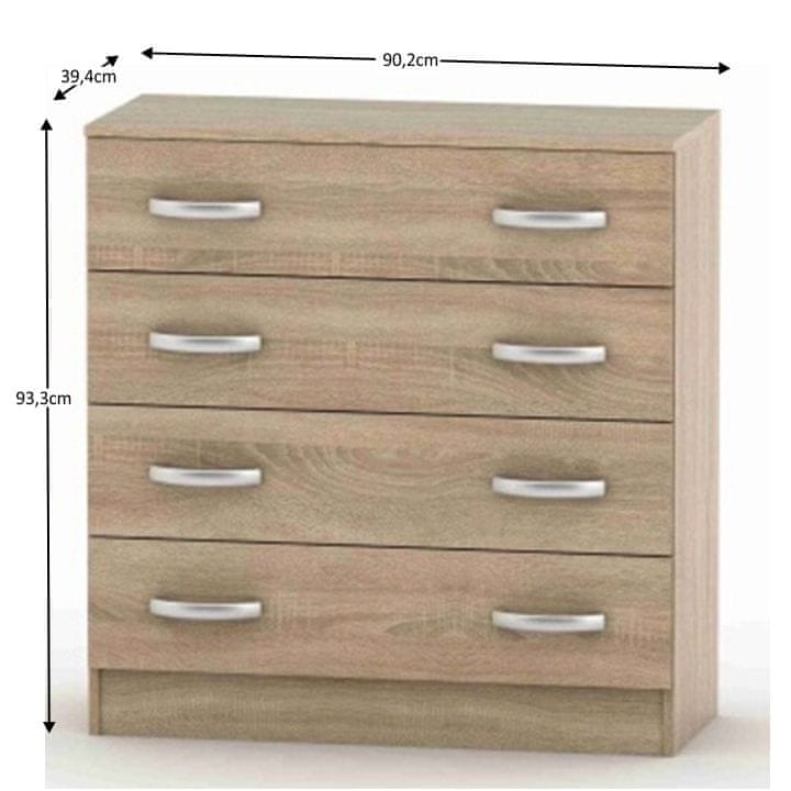 Spalnica ni običajen prostor v domu. Je prostor sprostitve, kraj, kjer se moramo po napornem dnevu zapreti, nabrati energije in dati svobodnega prostora svojim mislim. Zato bi ga morali urediti po pomembnosti. Napolnjena naj bo s prijetnim vzdušjem, udobjem in hkrati naj zagotavlja dovolj prostora za shranjevanje. BETTY 2, spalnica, je odlična izbira za zasluženo sprostitev po napornem dnevu. Predalnik Betty 2 bo za vas postal nenadomestljiv pomočnik. Njegova prednost je predvsem univerzalnost, saj ga lahko postavite tako rekoč kjer koli v stanovanju ali hiši. Za dnevno sobo, spalnico ali otroško sobo. Preprosto tam, kjer ga potrebujete. Zagotovo boste cenili njegove dimenzije (ŠxGxV): 90,2×39,4×93,3 cm, saj ima dovolj prostora za shranjevanje katerekoli vaše stvari. Za izdelavo je bil uporabljen DTD (iveral) laminiran, njegovo unikatnost pa dopolnjuje barvni dizajn hrast sonoma. Ima štiri predale, ki zagotavljajo veliko prostora za shranjevanje.