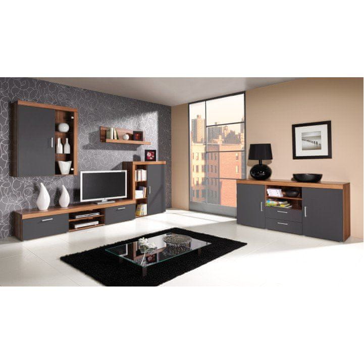 Stavite na kakovost čudovitega predalnika CHERIS 3. Na desni strani so polna vrata z elegantnim ročajem, leva stran je regalna. Dimenzije komode so (ŠxGxV): 90×35×114 cm. Neverjetno kul dnevna soba? Odgovor je pohištvo za dnevno sobo Cheris. Ekskluzivni sektor bo spremenil značaj katere koli sobe. Preproste linije poudarjajo brezčasnost kompleta. Pohištvo je izdelano iz laminiranega DTD (iverala). Barvna različica slive v kombinaciji s sivo grafitno je popoln dokaz za to.