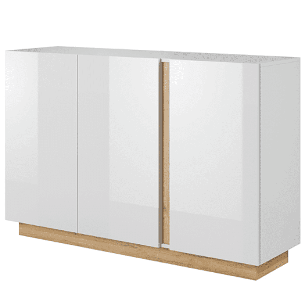 Trovratna komoda CITY 138 bo prava za vas. Zagotavlja vam prostor za shranjevanje, ki bo rešil vaše skrbi glede shranjevanja dokumentov, oblačil in vsega, kar potrebujete. Dimenzije omarice so (ŠxGxV): 138,2×40×90,5 cm. Moderno pohištvo za dnevno sobo, ki ponuja prefinjen videz, čiste linije in dovršene detajle, so poimenovali City. S tleskom prsta bo spremenil videz vaše dnevne sobe. Pohištvo je izdelano iz laminiranega DTD (iverala) in se ponaša z trpežnimi ABS robovi. Vrata so brez ročaja in se odpirajo s sistemom Push up touch. Barvna kombinacija hrast grandson, bela in beli sijaj bo dizajn vaše dnevne sobe dvignila na višjo raven.