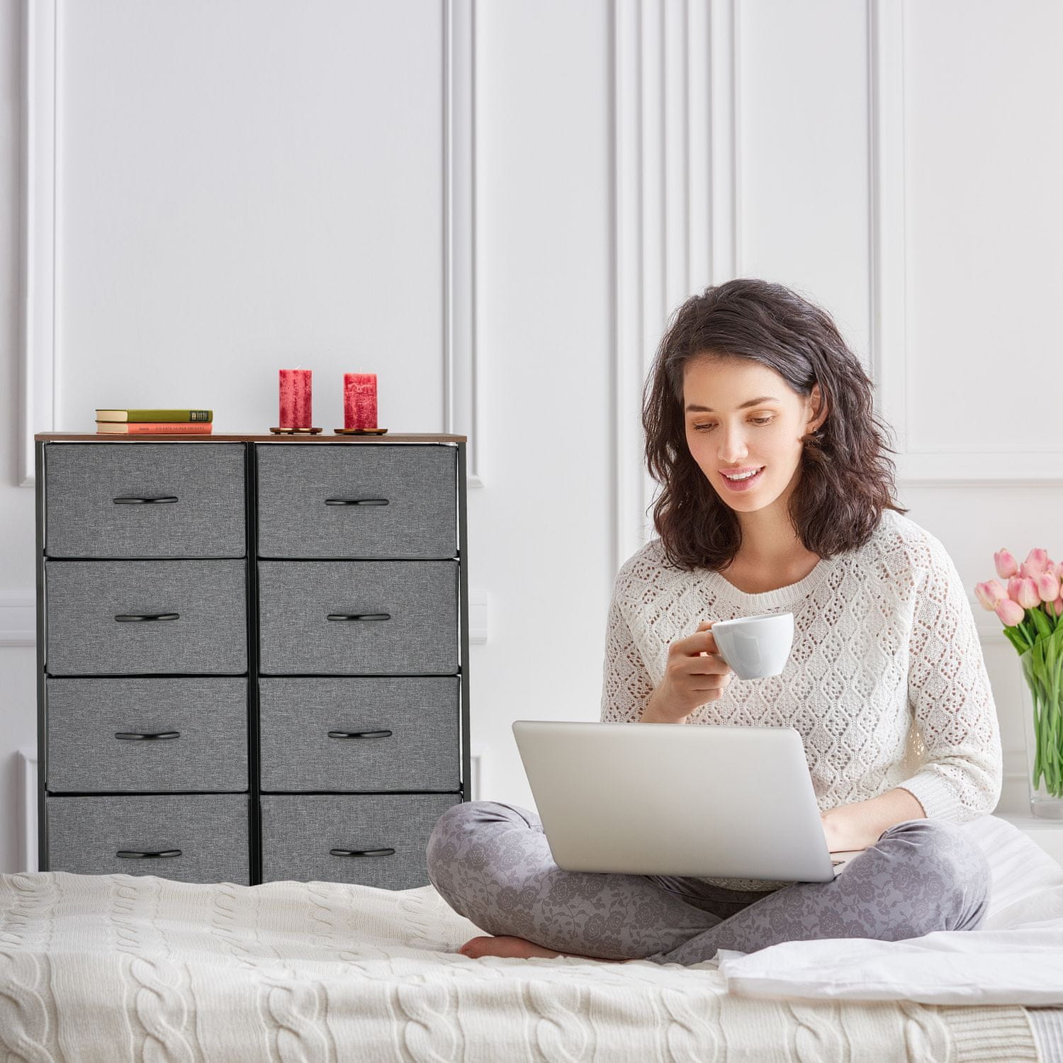 • Izboljšajte dekor s sodobnim dizajnom s sivim blagom in videzom temno rjavega lesa.