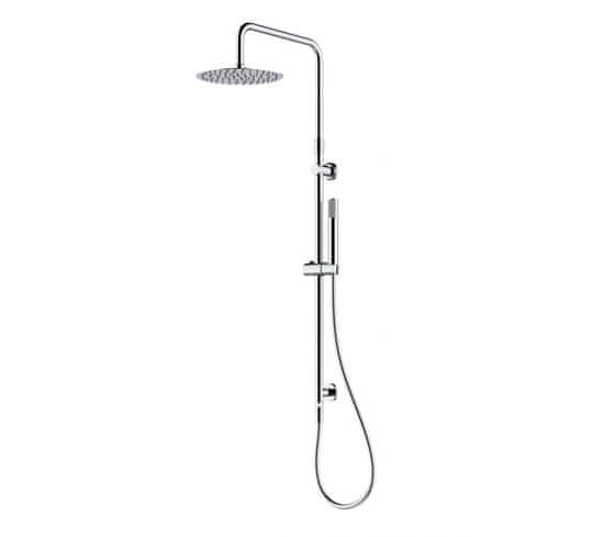 Eleganten pršni sistem iz kromiranega nerjavečega jekla, teleskopska palica prilagodljiva po višini ali na stran, enostavna montaža in priklop na obstoječo ali novo armaturo, inovativen vrtljiv preklopnik, nastavljiv zidni nosilec iz kromirane masivne medenine, tanka pršna glava fi 250 mm, nerjeveče jeklo, enostavno čiščenje, šobe za lahko odstranjevanje vodnega kamna, design tuš ročica, gibljivi pršni cevi 1,6 m