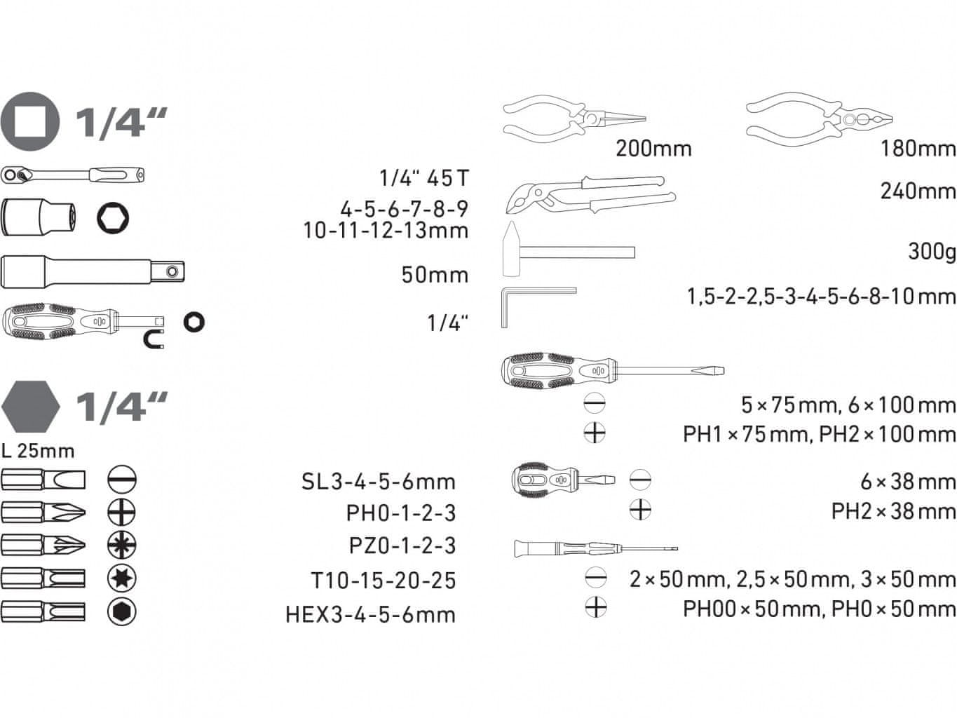 Priljubljeni izdelek komplet orodja 57 kosov, 1/4", crv. Celoten opis