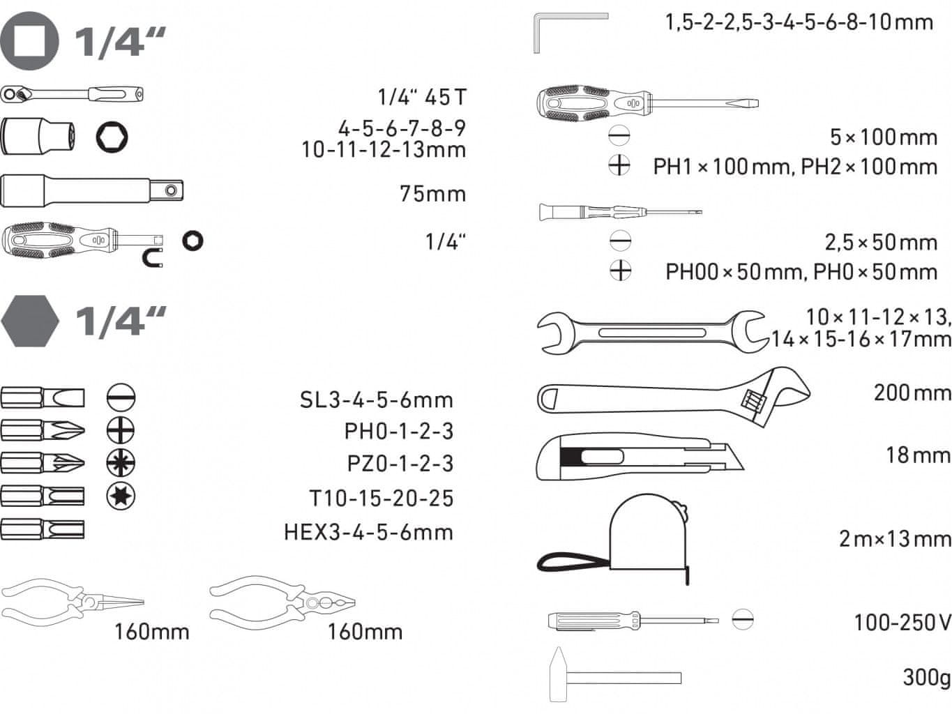 Priljubljeni izdelek komplet orodij 59 kosov, 1/4", crv. Celoten opis