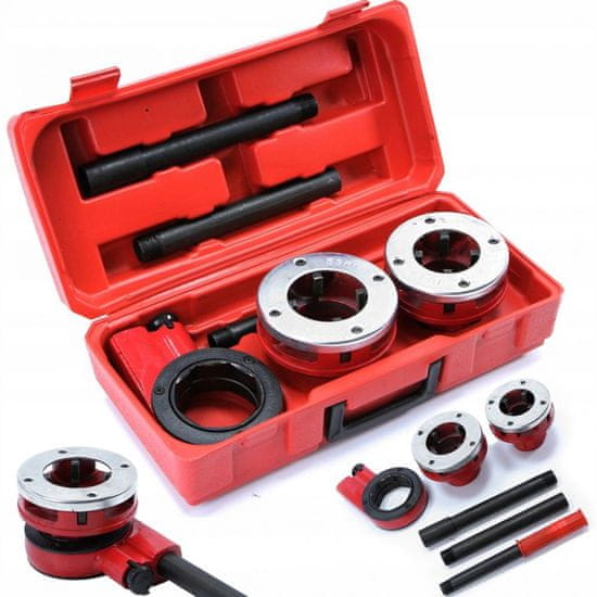 Navojni navoji v inčnem sistemu namenjeni za rezanje navojev na cevi. Set vključuje 2 pipi iz litega železa s 4 rezili iz orodnega jekla, glavo raglje in dvodelni ročaj. Vse shranjeno v plastični škatli. Celoten opis