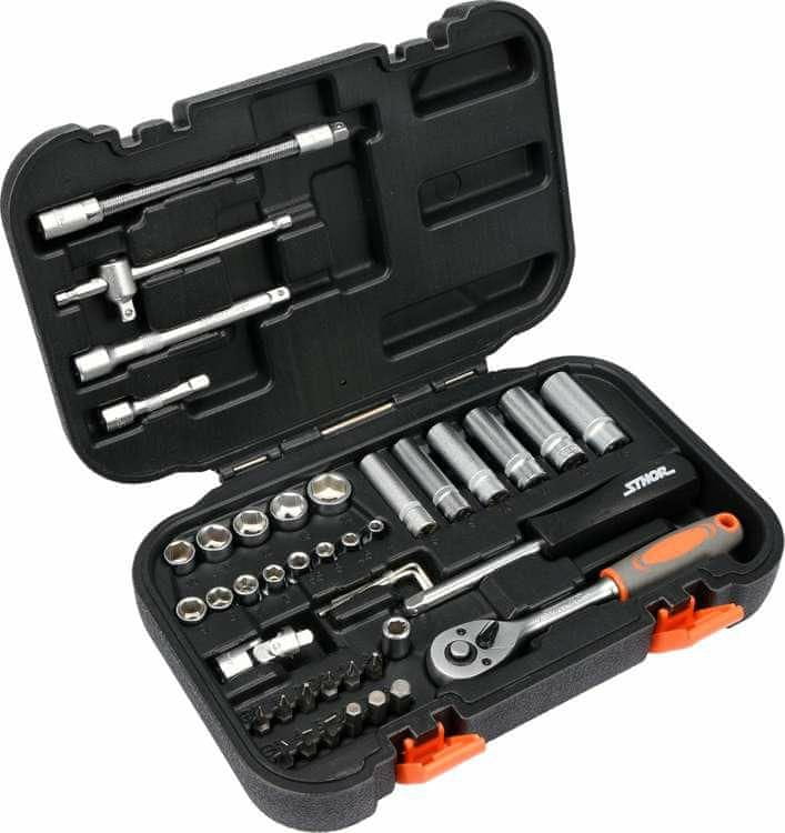 Komplet orodja STHOR je sestavljen iz 42 elementov, ki so v priročnem plastičnem kovčku. Orodja so natančno izdelana iz materialov, ki zagotavljajo njihovo zanesljivost. EAN: 5906083586415 Enota: KPL Vrsta vtičnice: AS-DRIVE Število elementov [kos.]: 42 Velikost [inch]: 1/4 Vsebina paketa – kratke vtičnice 1/4": 4; 4,5; 5; 5,5; 6; 7; 8; 9; 10 ; 11; 12; 13; 14 mm – dolgi ključi 1/4"": 8; 9; 10; 11; 12; 13 mm – podaljški 1/4" x 2 – fleksibilni podaljšek 1/4 „ – raglja 1/4“ 45T – 1/4" gumb za izvijač – 1/4" drsni gumb – 1/4" kardanski zglob – adapter za nastavke – Philips križni nastavki za izvijač: Ph0; Ph1; Ph2 – Pozidriv nastavki za križni izvijač: Pz0 ; Pz1; Pz2 – nastavki ploščati nastavki za izvijač: 3; 4; 5 mm – nastavki za šesterokotni izvijač: 6; 7; 8 mm – imbus ključi: 1,5; 2; 2,5 mm – kovček