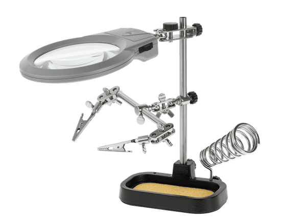 V kompletu je 2D lupa z 90 mm lečo, ki omogoča povečavo in omogoča natančen pregled majhnih komponent. Dodatna osvetlitev v obliki dveh LED diod zagotavlja dobro vidljivost in osvetlitev delovnega prostora, kar je še posebej pomembno pri natančnem spajkanju v slabi svetlobi. LED diode napajajo tri AAA baterije (niso priložene).