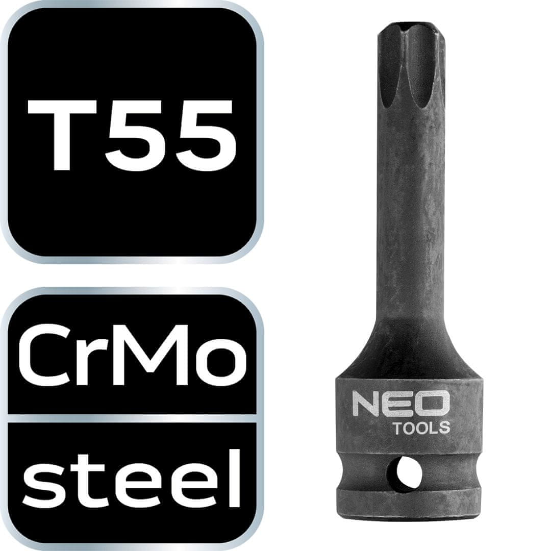 Udarni nastavek NEO T55 10–262 je zasnovan za udarna orodja. Izdelan je iz krom-molibdenovega jekla, zato je odporen proti koroziji, raztezanju in visokim temperaturam. Nastavek preprečuje neželen zdrs stebla iz nastavka. Na voljo je v velikosti T55. Blagovna znamka NEO izpolnjuje zahteve profesionalcev.