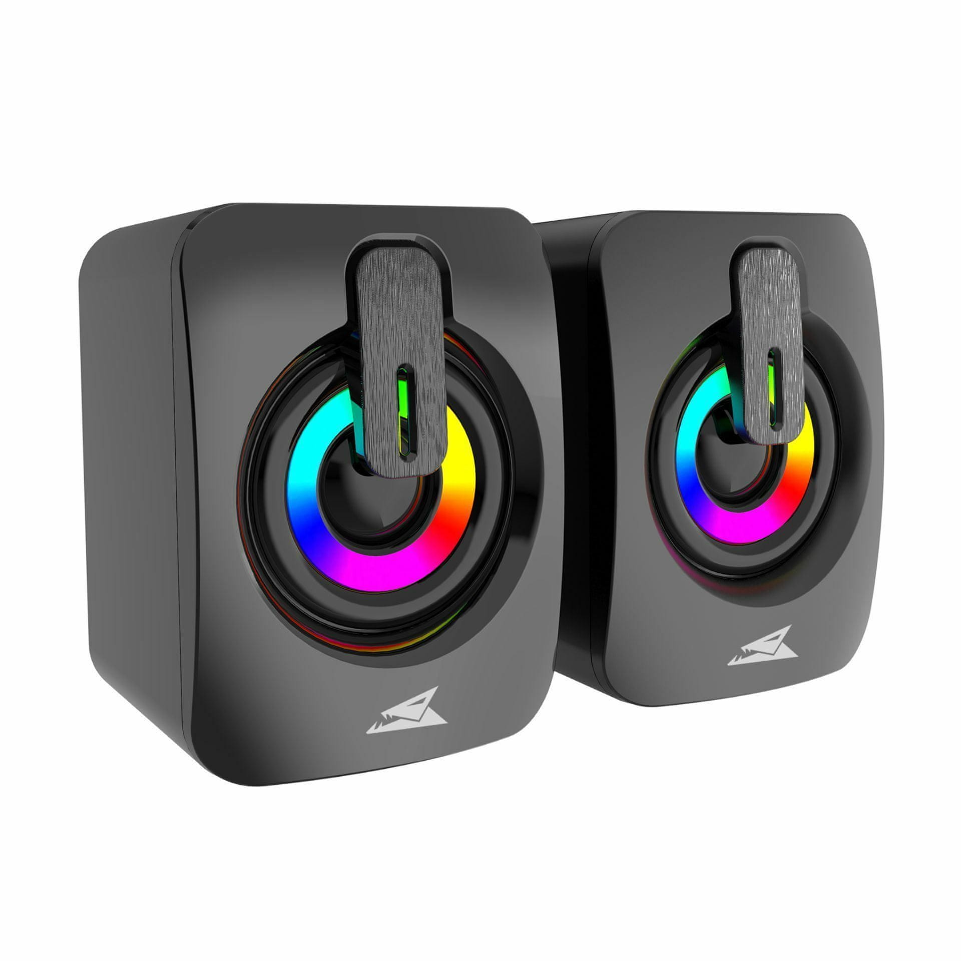 Stereo zvočniki Baracuda SEASHELL z močjo 2×3000 mW in širokim frekvenčnim odzivom 25Hz-20kHz zagotavljajo bogat in jasen zvok za igre, filme in glasbo. Elegantna črna zasnova z LED mavričnim učinkom prinaša dinamičen vizualni pridih, medtem ko kompaktne dimenzije omogočajo enostavno umestitev na vsako mizo. Priklop prek 3,5 mm stereo vhoda in USB zagotavlja visokokakovostno delovanje brez popačenj, kar zvočnike naredi idealne za zabavo in delo.
