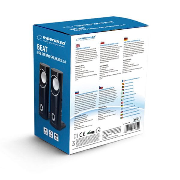 Visokokakovostni stereo zvočniki Esperanza BEAT za prenosnike in namizne računalnike zagotavljajo jasen in naraven zvok. Njihova elegantna zasnova se popolnoma prilega na mizo poleg LCD monitorjev in ostalih dodatkov. Združljivi so z vsemi računalniki, ki imajo zvočni izhod in USB vhod. Zvočniki vključujejo vgrajen gumb za vklop, nadzor glasnosti in izhod za slušalke. Iz izdelani so iz kakovostnih materialov in odporni na statične in elektromagnetne motnje.