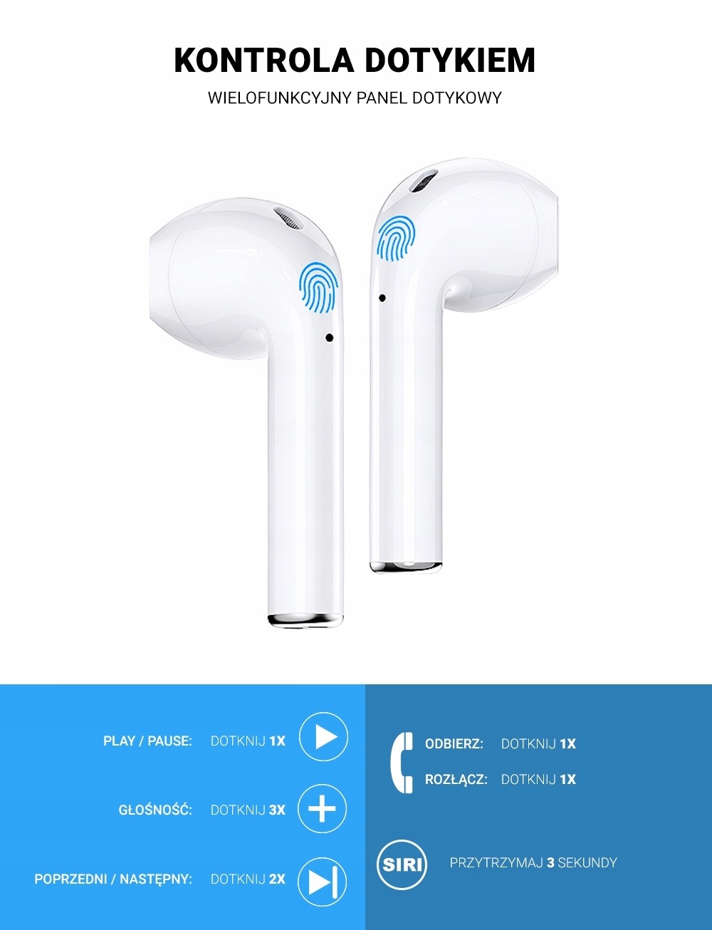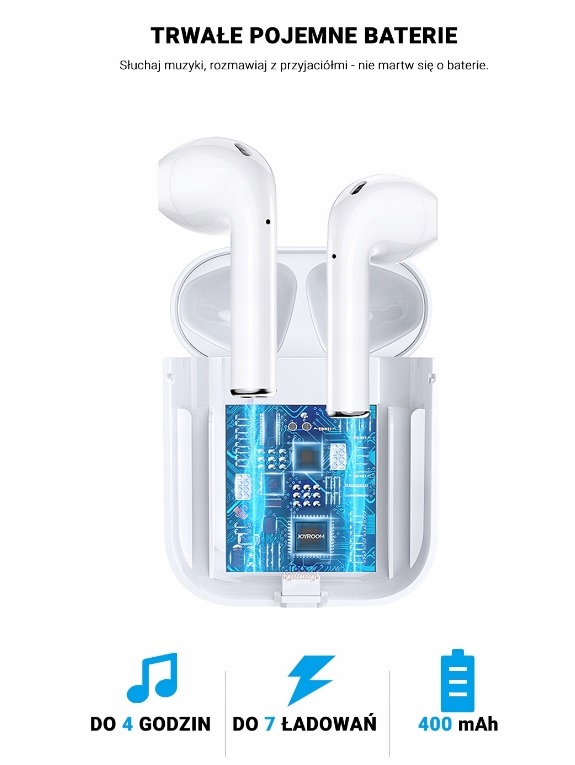 Slušalke, izdelane po vzoru priljubljenega modela AirPods (zasnova 1:1). Imajo tudi enake funkcije, združljive so z iOS in Android