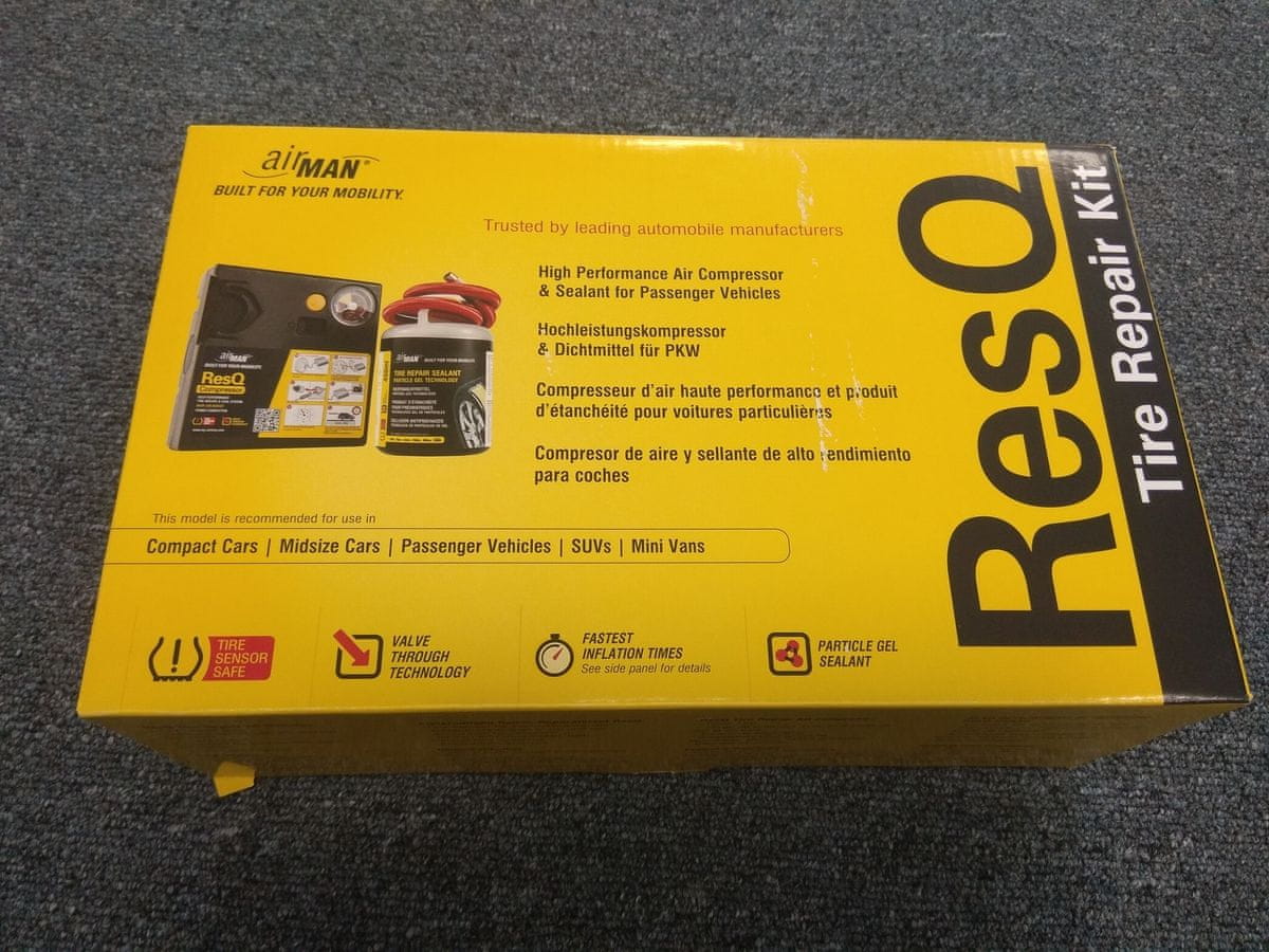 Komplet za popravilo pnevmatik ResQ proizvajalca AirMan komplet za popravilo pnevmatik vam bo pomagal v primeru, da na cesti spraznite pnevmatiko. To je hitra, preprosta in čista rešitev. Ta dvodelni sistem ki vključuje kompresor in stekleničko tesnilne mase, je zasnovan za vse vse vrste osebnih vozil.