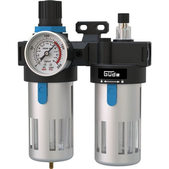 ZRAČNI REGULATOR S FILTROM IN MANOMETROM 1/4 Güde je profesionalni dodatek k vašemu sistemu stisnjenega zraka. Filtrirni tlačni reduktor zanesljivo odstranjuje kondenz iz stisnjenega zraka, obenem pa omogoča priročno nastavitev želenega tlaka. Posodo lahko enostavno izpraznite preko ventila na njenem dnu.