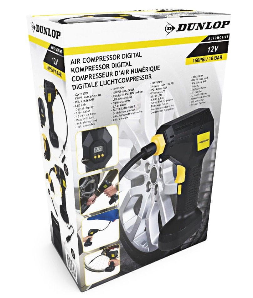 Pravilen tlak v pnevmatikah je zelo pomemben. S pravilnim tlakom imate boljši oprijem na cesti in boljši oprijem, zato vozite varneje zase in za druge udeležence v prometu. Nizek tlak v pnevmatikah povečuje tudi tveganje za razpočenje pnevmatike. Z Dunlopovo črpalko z zračnim kompresorjem imate napravo za vzdrževanje tlaka v pnevmatikah vedno pri roki. Črpalka za pnevmatike ima 12" zračno cev, lučko LED za osvetlitev delovnega območja, digitalni zaslon in možnost nastavitve PSI in bara po vaših željah do največ 150 PSI/10 barov. Digitalni zračni kompresor se napaja z vtičem z varovalko, ki ga lahko priključite v avtomobilski vžigalnik cigaret. POZOR: zračni kompresor nima akumulatorja!Kaj je zračni kompresor?Zračni kompresor pretvarja zunanji zrak v stisnjen zrak. Ta stisnjen zrak se nato prečrpa v različne napihljive izdelke, kot so avtomobilske pnevmatike, zračne blazine in druga oprema za kampiranje, kolesarske pnevmatike in bazeni. Upoštevajte največji zračni tlak, ki ga izdelek lahko prenese. Ta je pogosto izražen v denarju ali PSI. Črpalka Dunlopovega zračnega kompresorja ima največji tlak 150 PSI ali 10 barov in deluje z največjo močjo 12 V/120 W. Želeni zračni tlak lahko nastavite na digitalnem zaslonu pumpy.RŸzn dodatki in osvetlitev LEDDigitalni zračni kompresorski črpalki je priložena vrsta dodatkov, ki med drugim precej olajšajo napihovanje avtomobilskih pnevmatik. Da bo zračna črpalka na varnem, ji je priložena posebna torba za shranjevanje. Poleg tega paket zračnega kompresorja Dunlop vključuje 2 igli, ki ju lahko priključite na različne ventile. Varnostni vtič, ki se priključi na pnevmatiko zračnega kompresorja, se odlično prilega cigaretnemu vžigalniku vašega avtomobila. Da boste lažje videli, kaj počnete, tudi pri šibki svetlobi ali brez nje, je pod cevjo za stisnjen zrak nameščena lučka LED, ki osvetljuje delovno površino.Specifikacije Dunlop digitalni zračni kompresor črpalka za pnevmatikeMoč: 12V/120WMaksimalni tlak: 150 PSI/ 10 BARVključuje LED lučDigitalni zaslonZ merilnikom tlakaKabel 3,5 metra12-palčna zračna cevVtič z varovalkoPriložena vrečka za shranjevanjeVključuje 2 igliVključuje varnostni gumb