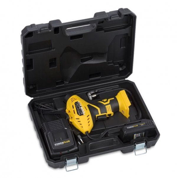 Lahki in kompaktni kompresor POWX1700 AKU podjetja Powerplus je shranjen v praktičnem kovčku. To vključuje cev, šobe, polnilnik in litij-ionsko baterijo s kapaciteto 1500 mAh.Žarnica LED, vgrajena v enoto, osvetljuje vaše delo.