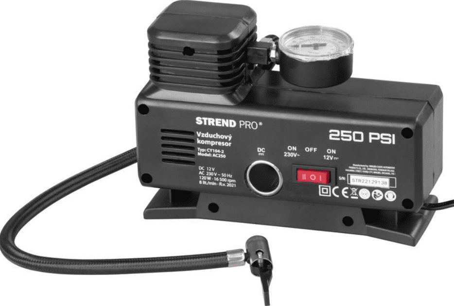 Ramda kompresor za avto AIRCOM AC250 je primeren za delo s stisnjenim zrakom, s tlakom do 250 PSI. Opremljen je s 3,5 m dolgim kablom in manometrom. Za pravilno delovanje ga le priključite na električno omrežje (230 V / 12 V) ali na vtičnico za cigaretni vžigalnik.