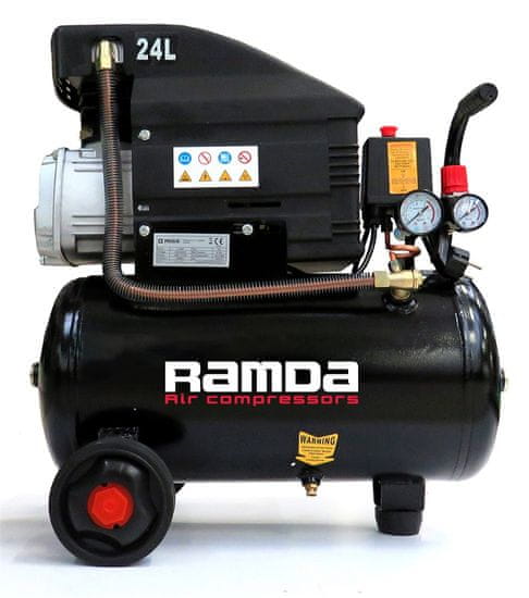 Ramda batni kompresor RA 430627 z močjo 1,1 kW, pretokom zraka 210 lit./min, 24-l tlačno posodo in stabilnimi kolesi. Celoten opis
