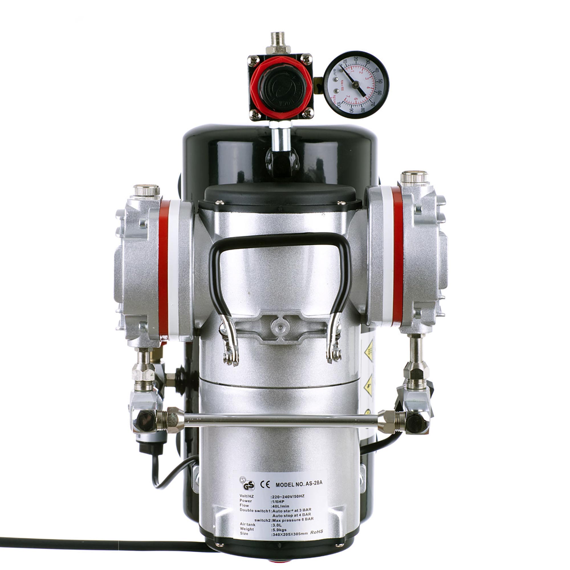 Dvobatni kompresor z visokim tlakom (do 6 barov) in učinkovitostjo (46 l/min). Zahvaljujoč kovinskemu ohišju je kompresor zelo vzdržljiv in odporen na mehanske poškodbe. Opremljen je z reduktorjem s prozornim manometrom, ki ima jasno lestvico, predstavljeno v dveh enotah. Kompresor napaja omrežna napetost 230 V in je odporen na prenapetosti 220–240 V.