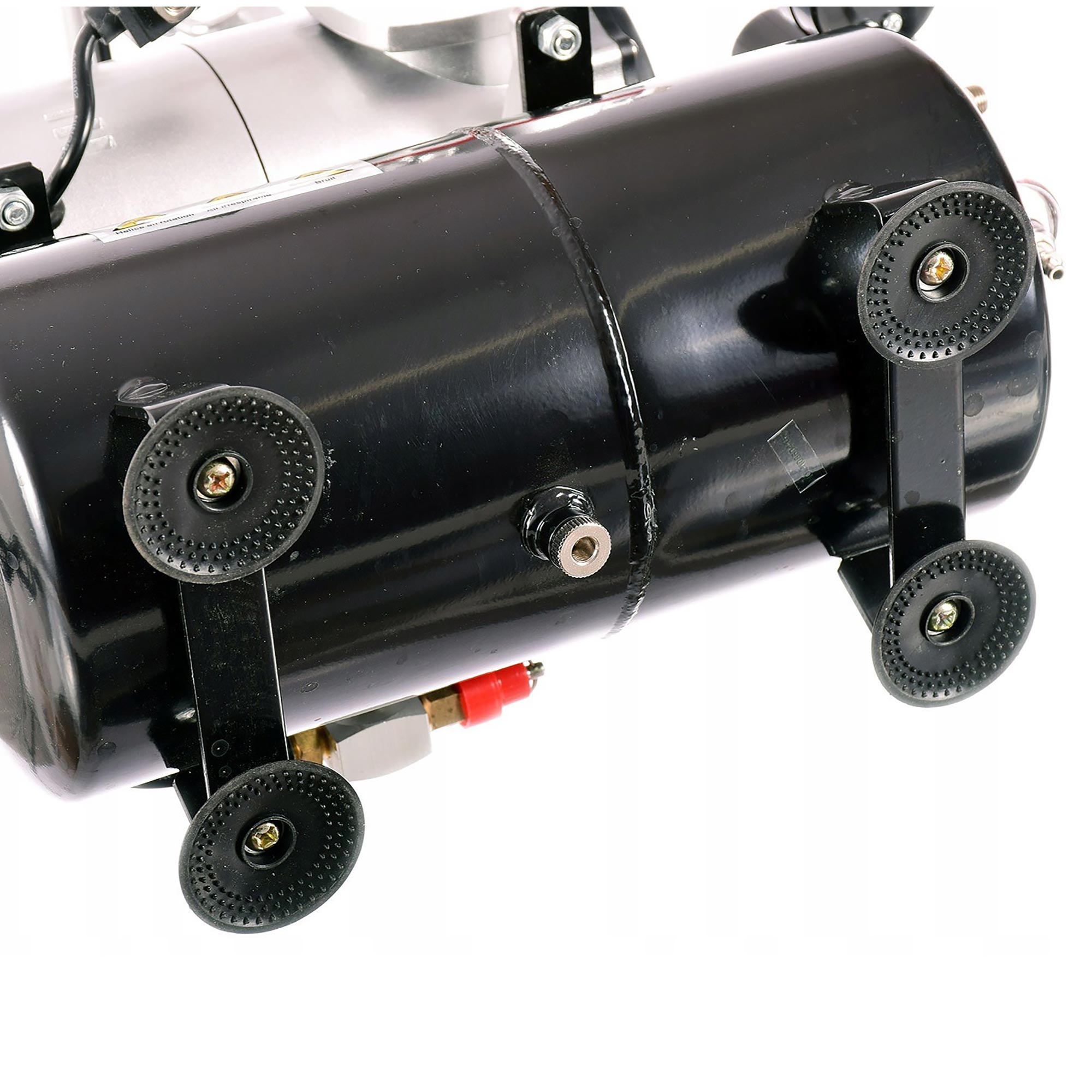 - GUMIJSTE NOŽICE - igrajo ključno vlogo pri tem kompresorju. Njihova oblika in material prispevata k blaženju vibracij, ki jih povzroča bat. Prav tako povečajo oprijem kompresorja na tleh.