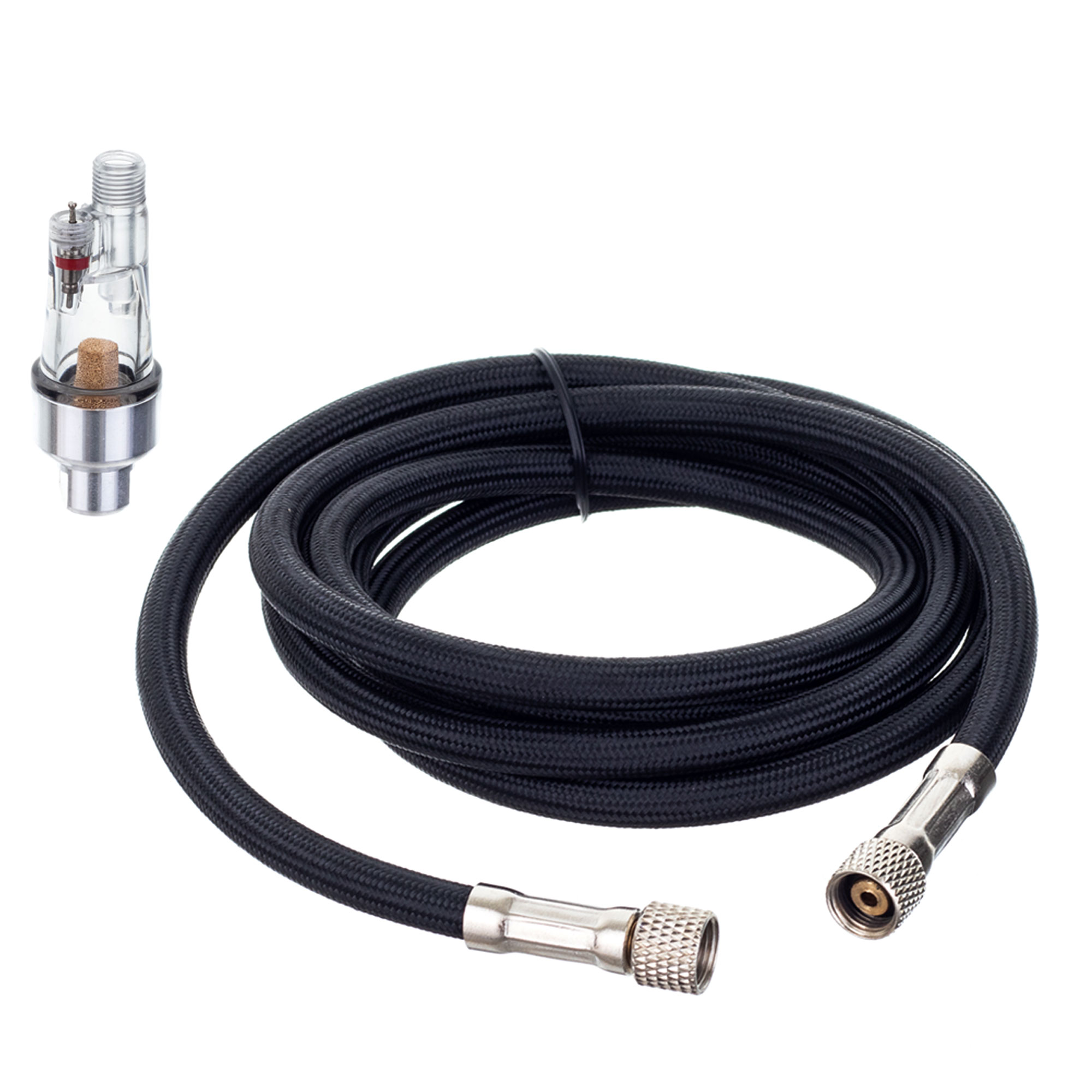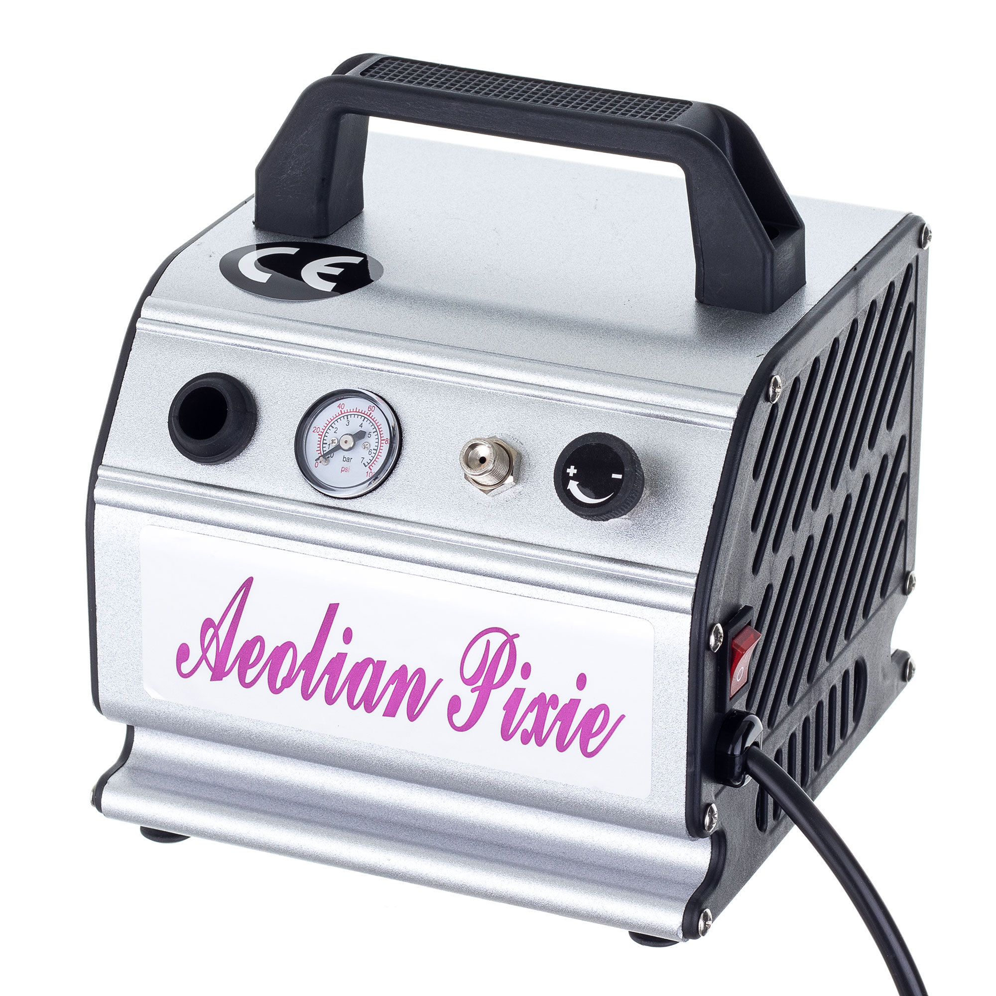 Izjemno praktičen, visokokakovosten kompresor za napajanje različnih vrst airbrush-ov. Ima manometer, ki prikazuje trenutni tlak, in postajo za shranjevanje airbrush-a med odmori. Kompresor je opremljen s funkcijo samodejnega START/STOP in hladilnim ventilatorjem v ohišju. Celoto dopolnjuje 1,8 m dolga cev z dvema 1/8" navojema in dehidrator, ki se neposredno priključi na airbrush.