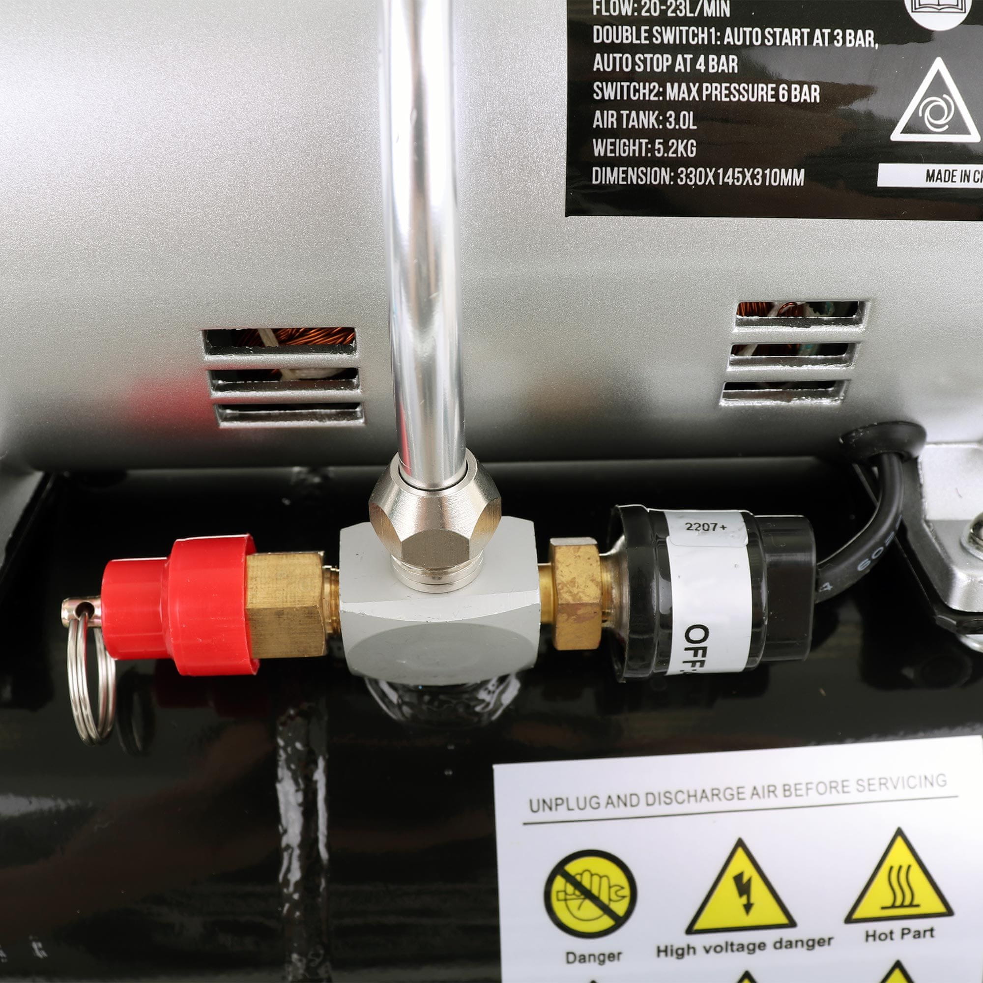 Kompresor je tih, zato umetnika med delom ne moti. Opremljen je z reduktorjem, filtrom in manometrom za merjenje tlaka. Ima tudi varnostni ventil.