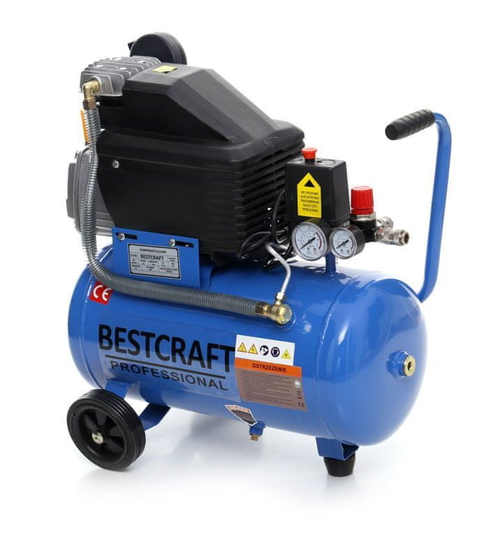Kompresor ima reduktor tlaka, opremljen z inovativnim mehanizmom za prilagajanje in odtočno pipo, ki je enostavna za uporabo.