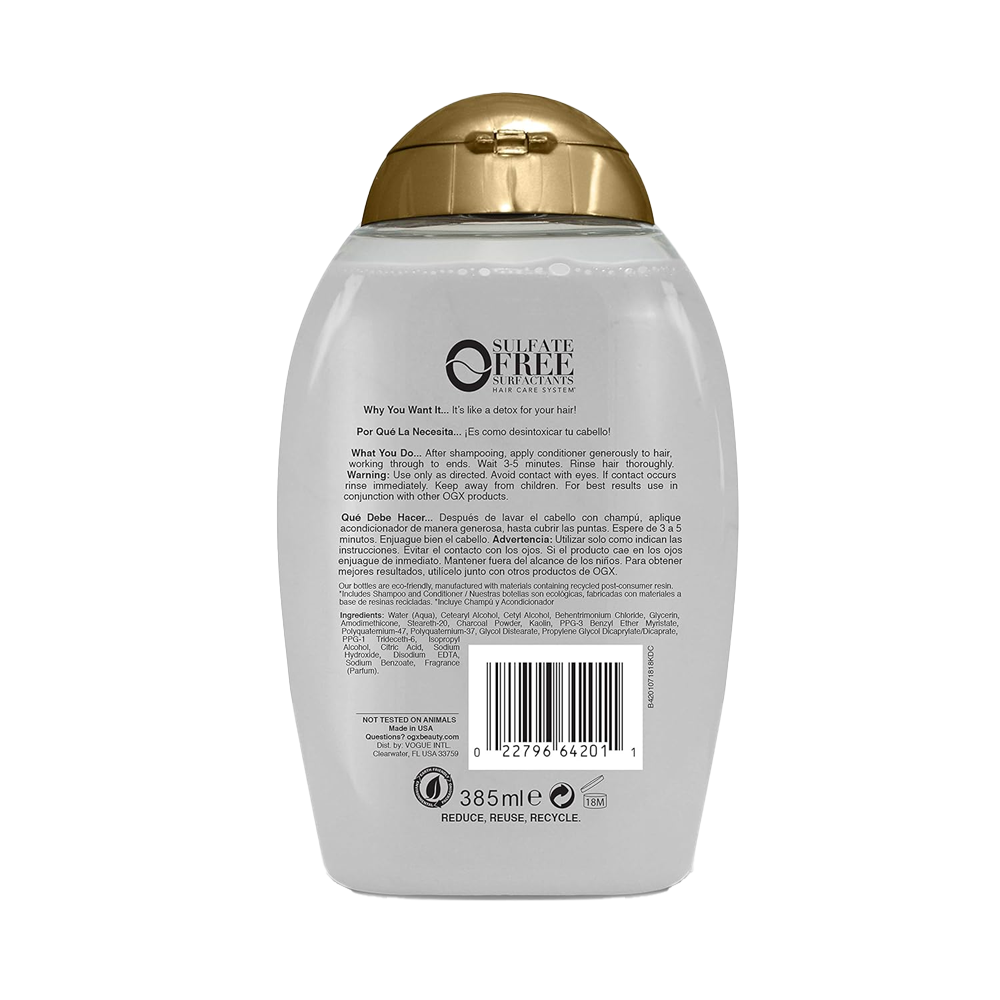 Po šamponiranju nanesite balzam na celotno dolžino las, s poudarkom na konicah. Pustite delovati 3–5 minut, nato temeljito sperite. Za najboljše rezultate uporabite s šamponom OGX Charcoal Detox.