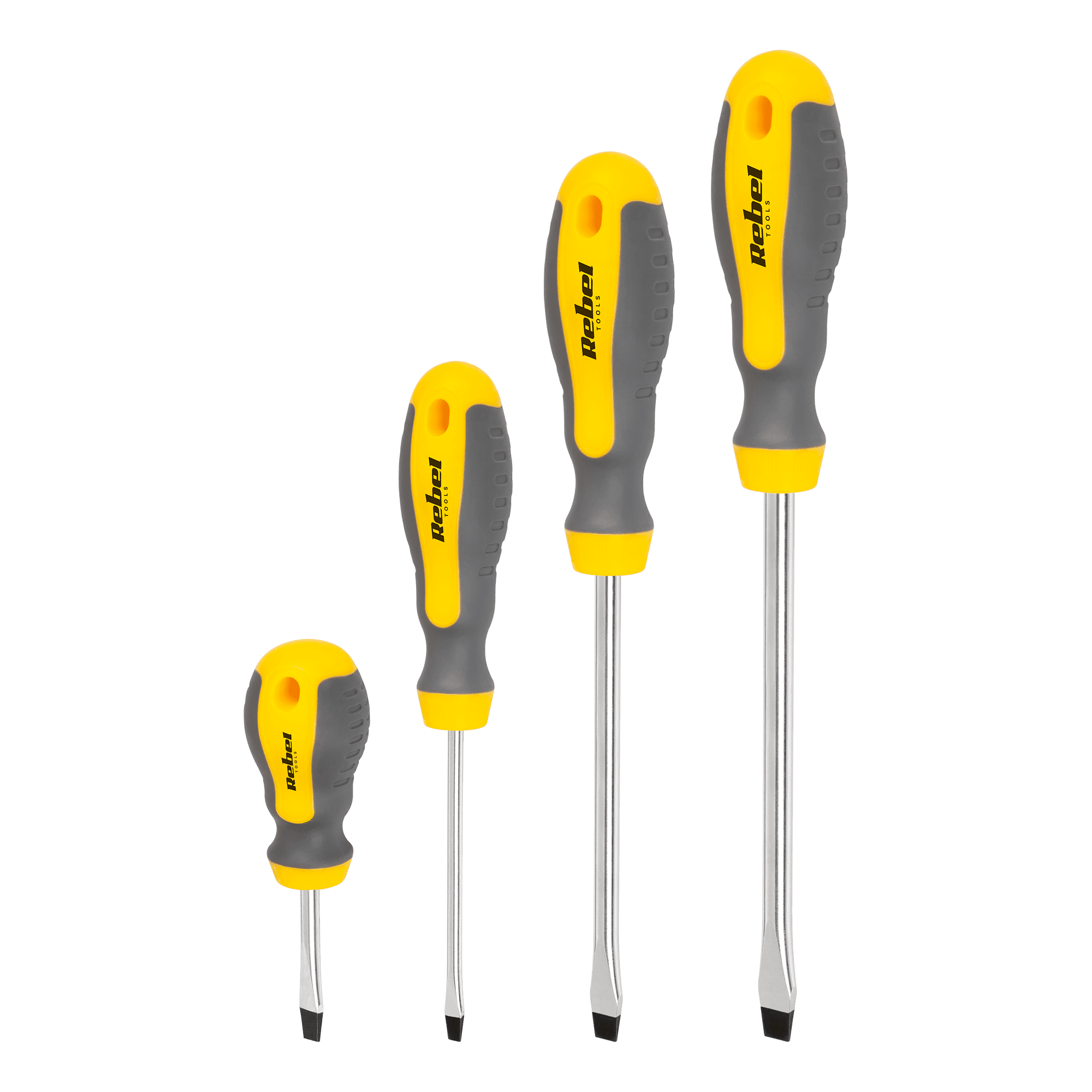 Rebel Tools ponuja komplet 8 izvijačev, ki so popolni za vsako delavnico. Vsestranskost tega kompleta povečujeta dve vrsti izvijačev: ravni in križni. Zahvaljujoč ergonomskim ročajem se izvijači Rebel Tools popolnoma prilegajo vaši roki, zahvaljujoč konstrukciji iz krom-vanadijevega jekla, ki je odporna proti koroziji in rji, pa bodo zdržali dolgo časa.