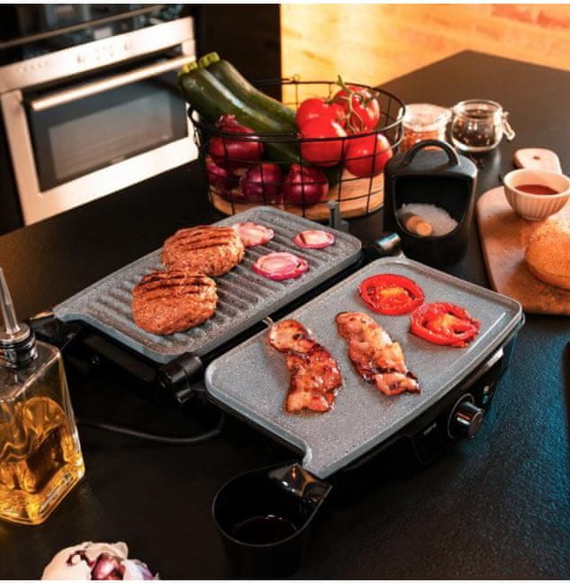 • 180° odpiranje, 2 pladnja za odvečno maščobo in kontrolna lučka za udobno uporabo.