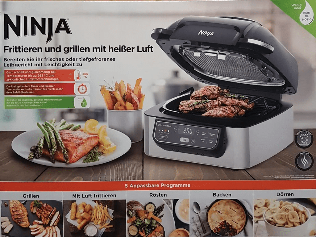 Žar in električni cvrtnik Ninja AG551EU olajšata vsakodnevno kuhanje s kombinacijo natančnega sistema Smart Cook, digitalne sonde in enakomernega segrevanja do 265 °C. V domači kuhinji nadomesti več naprav hkrati – obvlada žarjenje brez obračanja, cvrtje z minimalno količino olja, peko, gratiniranje in sušenje. S tem cvrtnikom enostavno pripraviš vse – od sušenega mesa in pečene zelenjave do sočnih steakov. Vse najdeš v priloženi knjigi receptov. Velika prostornina 5,7 l in nelepljivi deli primerni za pomivalni stroj omogočajo pripravo celotnega obroka za vso družino.
