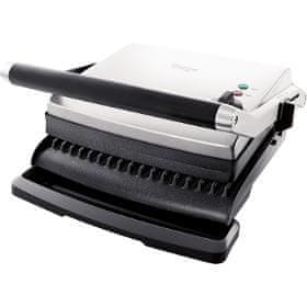 Za pripravo različnih vrst mesa, rib, zelenjave, sendvičev itd. na žaru. Spodnja in zgornja plošča za žar – rebrasta Plošče za žar s posebno prevleko Quantanium TM, ki se ne prijema Nagibne nogice za nagibanje spodnje plošče za odtekanje odvečne maščobe v posodo za kapljice ali za izravnavo spodnje plošče Nastavljiva višina zgornje plošče Spremenljiva nastavitev temperature 180–220 °C Svetlobna indikacija za priklop v omrežno vtičnico in segrevanje žar plošč Odstranljiv pladenj za odtekanje maščobe in sokov Ščetka za čiščenje za čiščenje površin žara (priložena) Priključna moč 2200 W Narejen iz nerjavečega jekla in zlitine plemenitih kovin