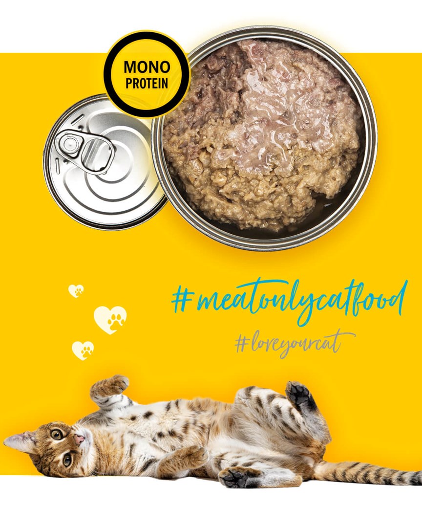 Naša vodilna hrana je bila razvita kot mokra hrana na osnovi 100 % piščanca – popolna, uravnotežena in idealna za odrasle mačke, ki potrebujejo izločilno dieto. Vsebuje srca, želodčke in jetra – natanko tako, kot bi mačke jedle svoj plen v divjini. Pasme, kot so abesinijska, bengalska in maine coon mačka, cenijo vsak del piščanca, ne le stegen in kril. Monobjakovinska hrana, pripravljena v lastni juhi.
