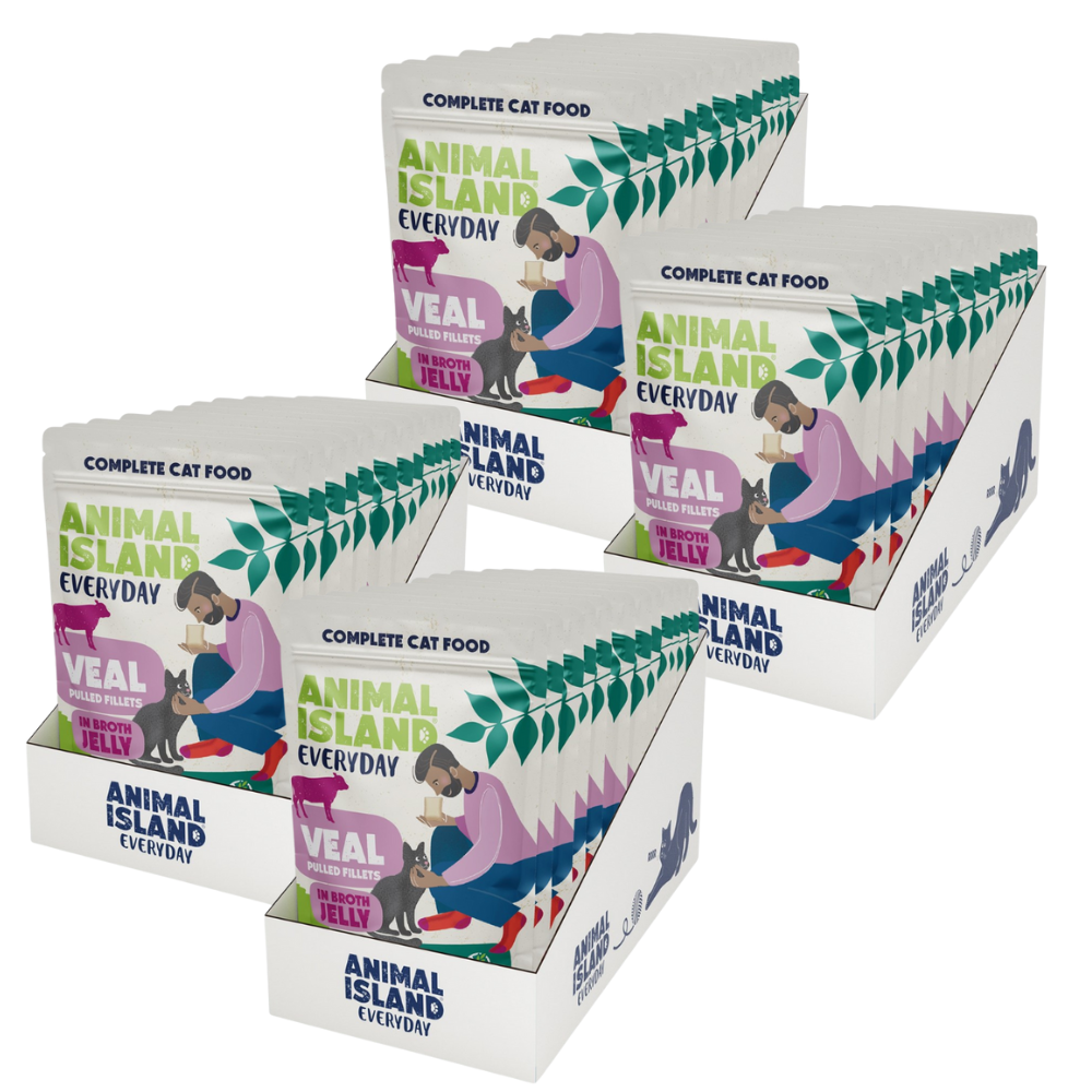 Animal Island Everyday – Natrgani telečji fileji v želeju iz juhe so edinstvena mokra hrana, ustvarjena z mislijo na mačke. Gurmanske mačke vseh pasem. Vsaka vrečka vsebuje nežne, lahko prebavljive koščke telečjega mesa, prelite z aromatičnim želejem iz bogate juhe.