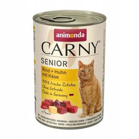 ANIMONDA Carny Senior je mokra hrana z govedino, piščancem in sirom za vse starejše mačke. Hranjenje starejših mačk zahteva posebno pozornost, saj je ključnega pomena, da jim zagotovimo vse sestavine, ki bodo podpirale njihovo odlično zdravje, kondicijo in agilnost. Oblika hrane je prav tako pomembna, saj spodbuja prehranjevanje in olajša žvečenje. Da bi zadostili edinstvenim potrebam starejših mačk, je ANIMONDA ustvarila serijo Senior na osnovi svežega mesa, ki je odličen vir beljakovin. Za razliko od psov so mačke mesojedci, zato so živalske beljakovine bistvenega pomena za njihovo zdravje. Podpirajo zdravo telesno strukturo, kar je še posebej pomembno, ko se vaša mačka stara. Vitka postava in zadostna mišična masa bosta pripomogli k ohranjanju vitalnosti dlje časa in ne bosta dodatno obremenjevali sklepov. Mokra formula bo v kombinaciji z odličnim okusom spodbudila k prehranjevanju tudi najbolj izbirčne jedce. Kompleks dragocenih aminokislin in mineralov bo podpiral pravilno delovanje notranjih organov, rastlinske vlaknine pa bodo izboljšale občutljiv prebavni sistem.