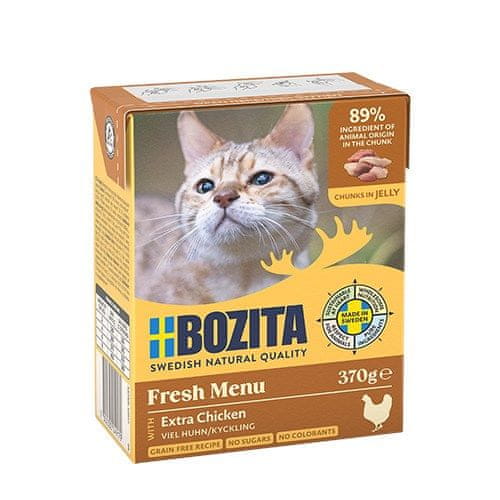 Bozita mesni koščki s piščancem v želeju so uravnotežena, popolna hrana za mačke vseh pasem. Zdrav, svež švedski piščanec naredi Bozita mesne koščke s piščancem v želeju ne le okusne, ampak tudi lahko prebavljive, kar olajša absorpcijo hranil. Vsebuje MacroGard®, naravni β-glukan, ki podpira zdrav imunski sistem. Ne vsebuje mesnega prahu, glutena, ojačevalcev okusa ali konzervansov. 100 % beljakovin v hrani je živalskega izvora. Skrbno uravnotežena raven vitaminov in mineralov zadovoljuje potrebe mačk. Hrana Bozita je proizvedena v osrčju švedskega podeželja iz najkakovostnejših sestavin. Visoka vsebnost svežega švedskega piščanca, jagnjetine, severnih jelenov in losov pomeni visoko raven živalskih beljakovin, ki so bistvenega pomena za zdrave mačke. Skrbno uravnotežena raven vitaminov in mineralov v kombinaciji z visokokakovostnimi sestavinami naredi hrano Bozita izjemno okusno in lahko prebavljivo.