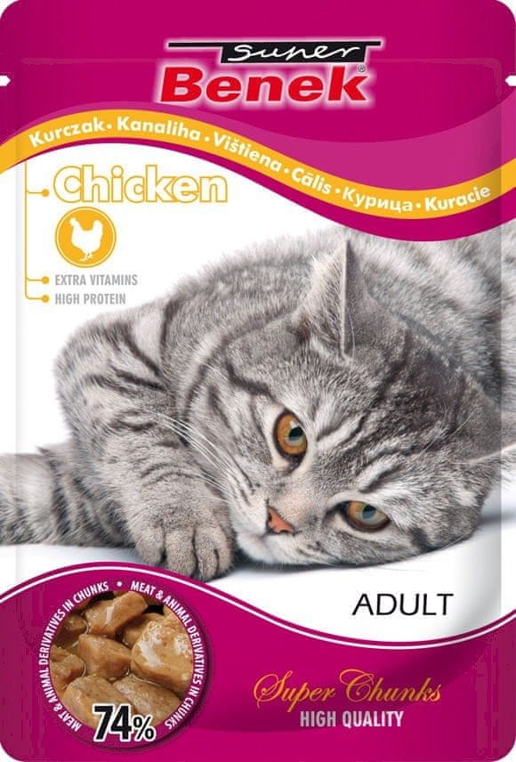 Super Benek Adult s piščancem je popolna mokra hrana za odrasle mačke, ki vsebuje okusne mesne grižljaje s piščancem v aromatični omaki, okusu katerega se nobena mačka ne bo uprla.