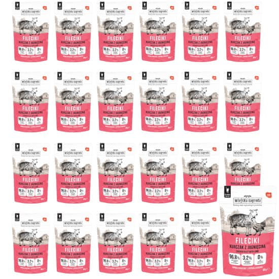 WIEJSKA ZAGRODA Piščančji in jagnječji fileji so visokokakovostna mokra hrana za mačke, ustvarjena z ljubeznijo do živali ter z mislijo na njihovo zdravje in vitalnost. Vsako pakiranje vsebuje 24 vrečk po 85 g okusnih piščančjih filejev, obogatenih z nežno jagnjetino, ki zagotavljajo edinstveno okusno izkušnjo tudi za najbolj izbirčne mačke.