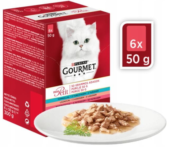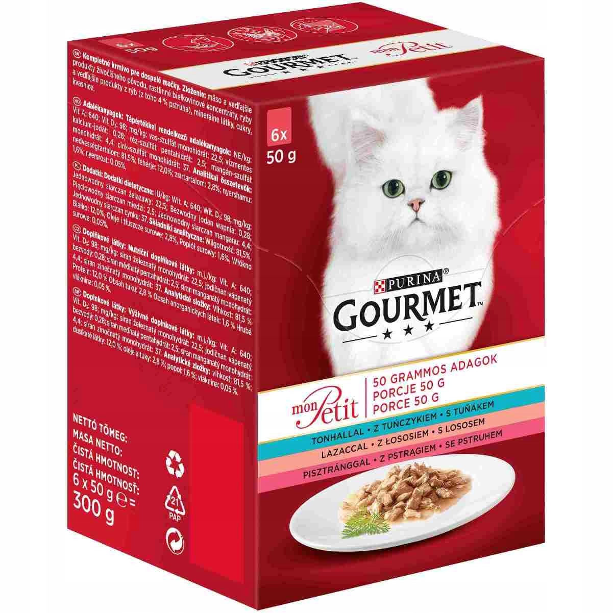 Gourmet Mon Petit mešanica rib je komplet okusnih ribjih jedi v vrečkah, namenjenih odraslim mačkam. Kremna konsistenca v kombinaciji z odličnim okusom in aromo bo navdušila tudi najbolj zahtevne gurmane. Poleg izjemne okusne izkušnje bo ta hrana našim kosmatim prijateljem zagotovila vsa bistvena hranila. Hrana je narejena iz najkakovostnejših sestavin, brez dodanih žit ali umetnih barvil. Postrezite svoji mački Gourmet Mon Petit, da se bo počutila kot v pravi restavraciji!