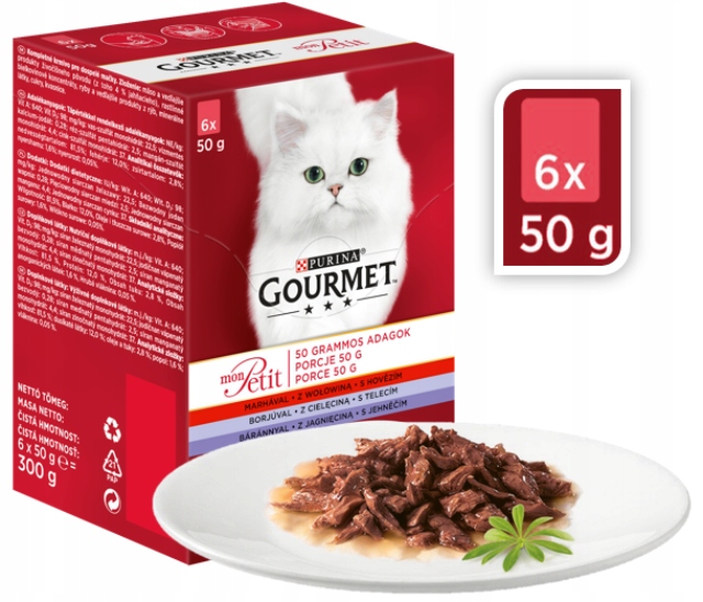 Gourmet Mon Petit mesna mešanica je komplet okusnih mesnih jedi v vrečkah, namenjenih odraslim mačkam. Kremna konsistenca v kombinaciji z odličnim okusom in aromo bo navdušila tudi najbolj zahtevne gurmane. Poleg izjemne okusne izkušnje bo ta hrana našim kosmatim prijateljem zagotovila vsa bistvena hranila. Hrana je narejena iz najkakovostnejših sestavin, brez dodanih žit ali umetnih barvil. Postrezite svoji mački Gourmet Mon Petit, da se bo počutila kot v pravi restavraciji!
