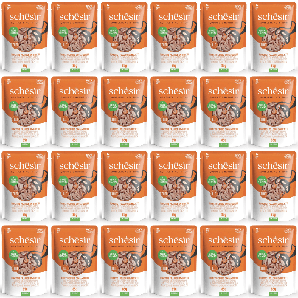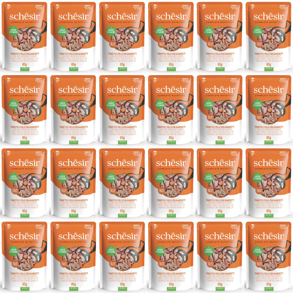 SCHESIR Mokra hrana za mačke s tuno, piščancem in kozicami v želeju 24×85g