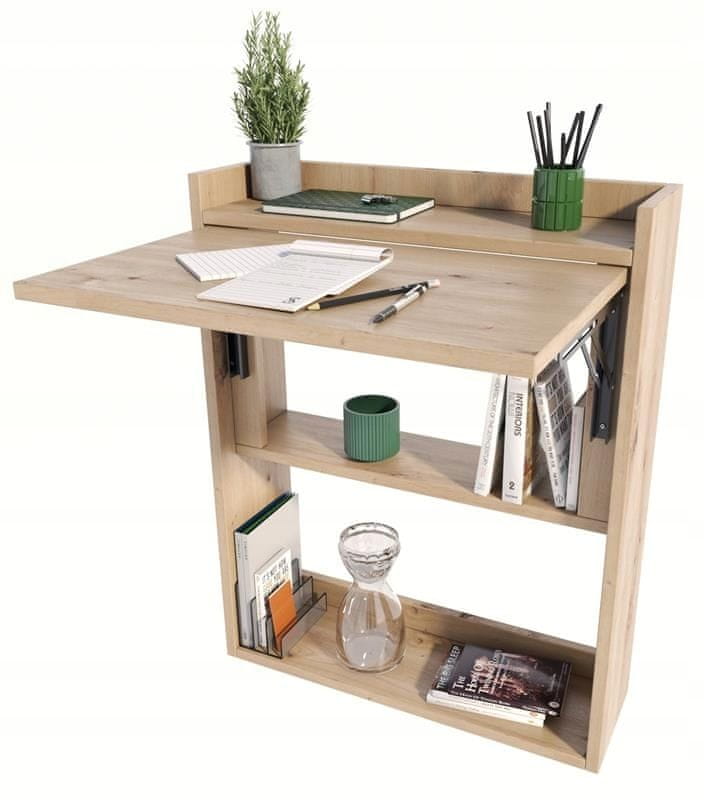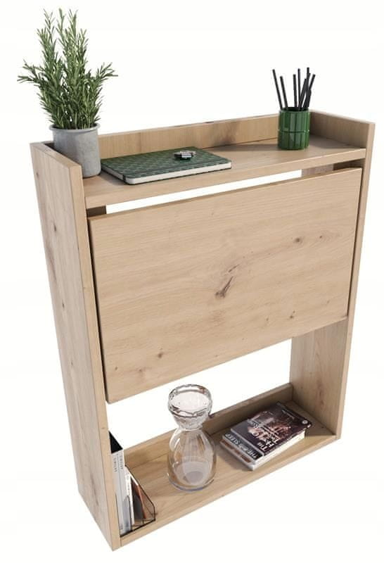 Zložljiva stenska pisalna miza, omarica, polica, knjižna omara Artisan. Moderna in večnamenska stenska pisalna miza je odlična rešitev za majhne prostore. Pohištvo ima obliko omare, ki jo lahko enostavno obesite na steno. Če ga želite uporabljati kot pisalno mizo, preprosto izvlecite polico in dobili boste praktično mizno površino. Polica ima dovolj prostora za računalnik in za shranjevanje najnujnejših predmetov, tako da bodo vedno pri roki. Pisalna miza bo dobro delovala tako doma kot v pisarni. Enostavno ga je namestiti in tudi enostavno ga je vzdrževati čisto. Pisalna miza je izdelana iz visokokakovostne laminirane plošče, debeline 18 mm. Pohištvo je dostavljeno v paketu za samostojno sestavljanje skupaj s pripomočki in navodili. Dimenzije: Višina: 85 cm Širina: 70 cm Globina: 20 cm Dimenzije police: Dolžina: 65,8 cm Širina: 36 cm DRAŽBA JE ZA BARVO ARTISAN OAK. DODATNE INFORMACIJE: Pohištvo je izdelano na Poljskem pri poljskem proizvajalcu. Pohištvo je dostavljeno v paketih za samostojno montažo. Paket vsebuje navodila in vse elemente, potrebne za sestavljanje pohištva.