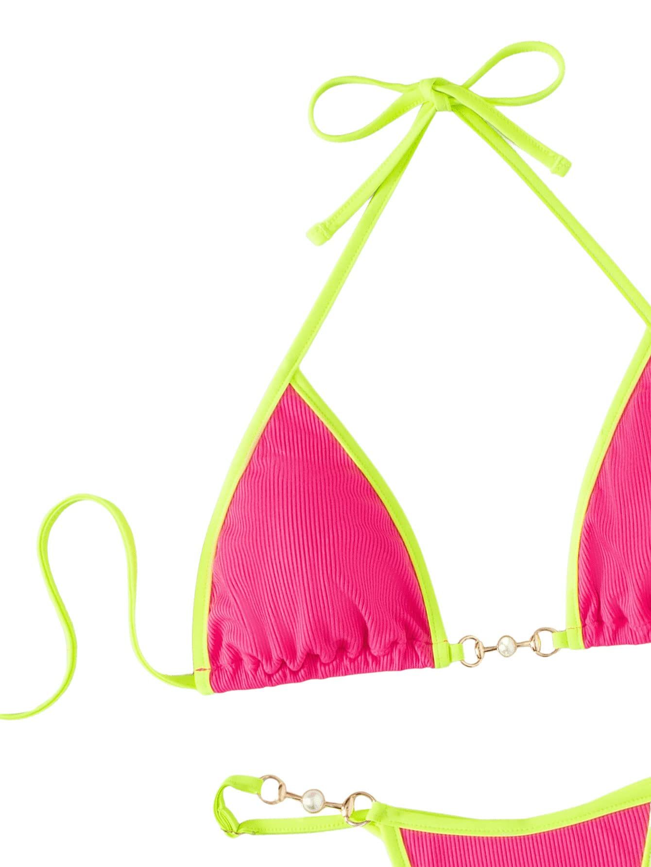 Nikcorp Ženske dvodelne kopalke brazilski bikini komplet z biseri in obročki, trikotni kroj, hitrosušeč material, rožnate, velikost M