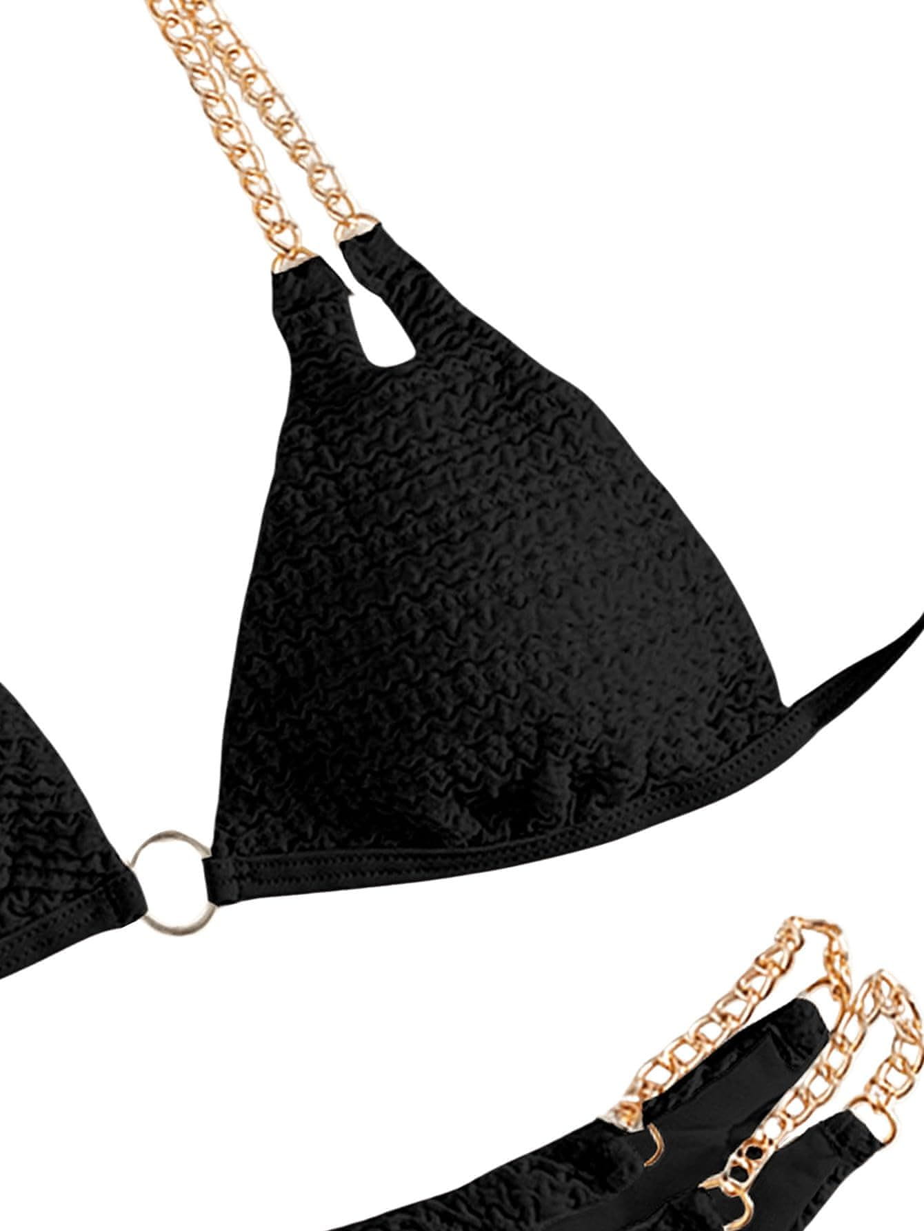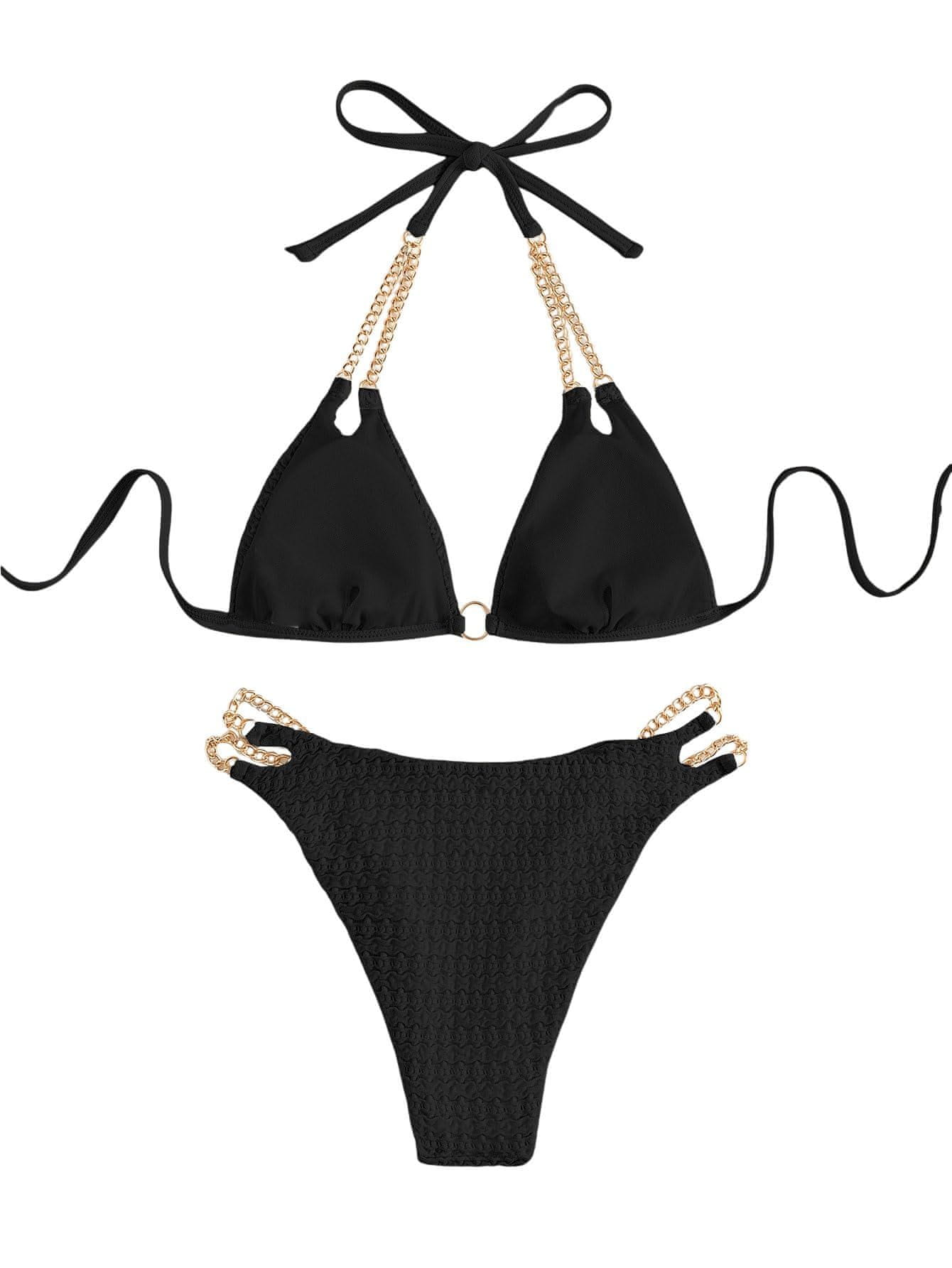 Nikcorp Ženske kopalke dvodelne bikini z zlatimi verižicami, eleganten glamour komplet s halter vezanjem, črne barve, velikost S