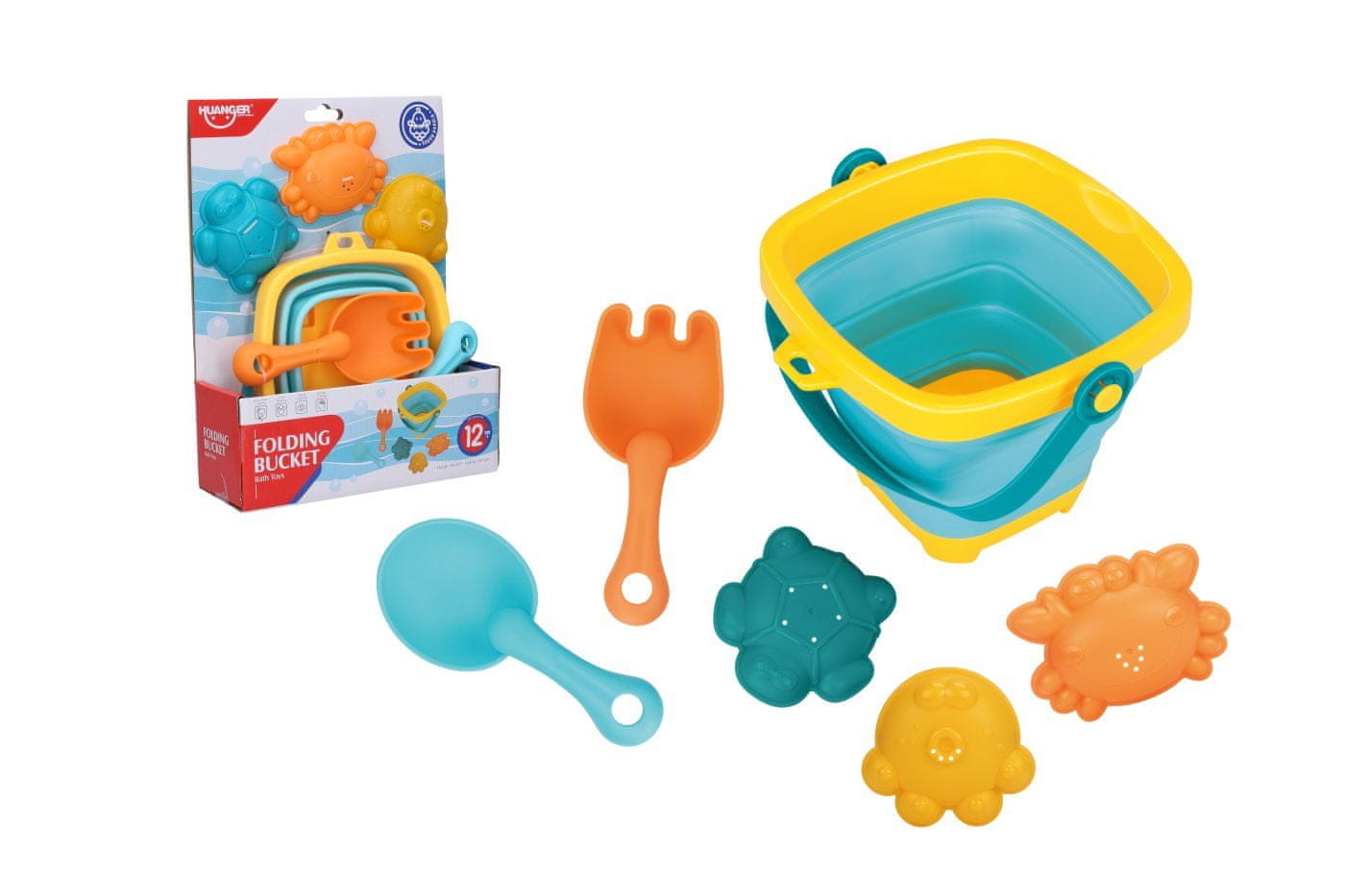 Zložljivo vedro za kopel ali pesek. Vsebina paketa – zložljivo vedro 19×18 cm, 3 modelčki – želva, rakovica, žaba, grabljice in lopata.