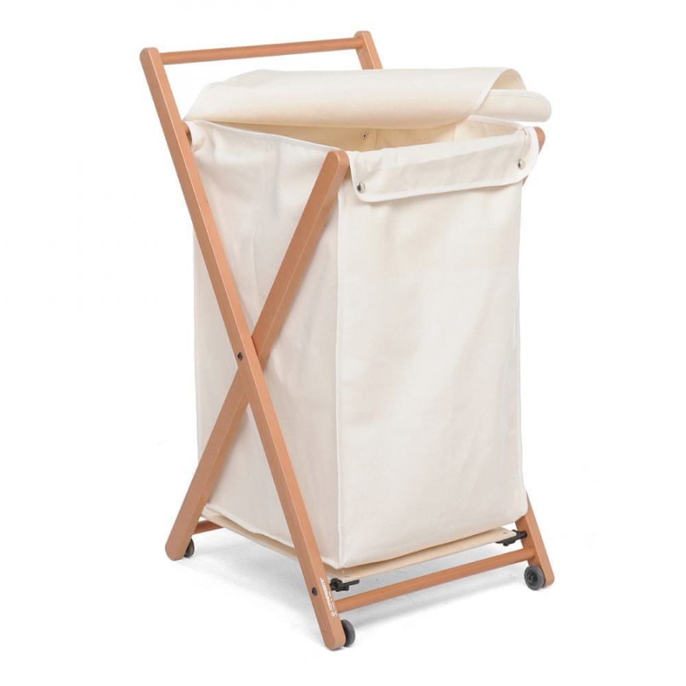 Leseni voziček za perilo Angel podjetja Foppapedretti je zelo kompakten in ko je zložen zavzame malo prostora.