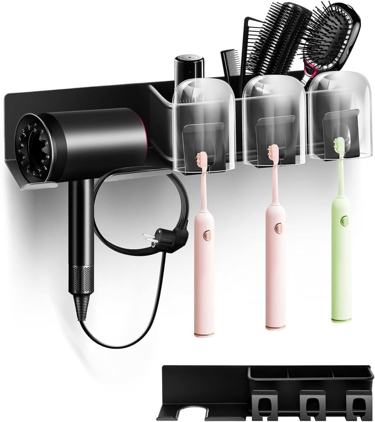 Nikcorp Stenski organizator za kopalnico črn | Večnamensko držalo za sušilnik za lase in kozmetiko brez vrtanja 39x8x9 cm