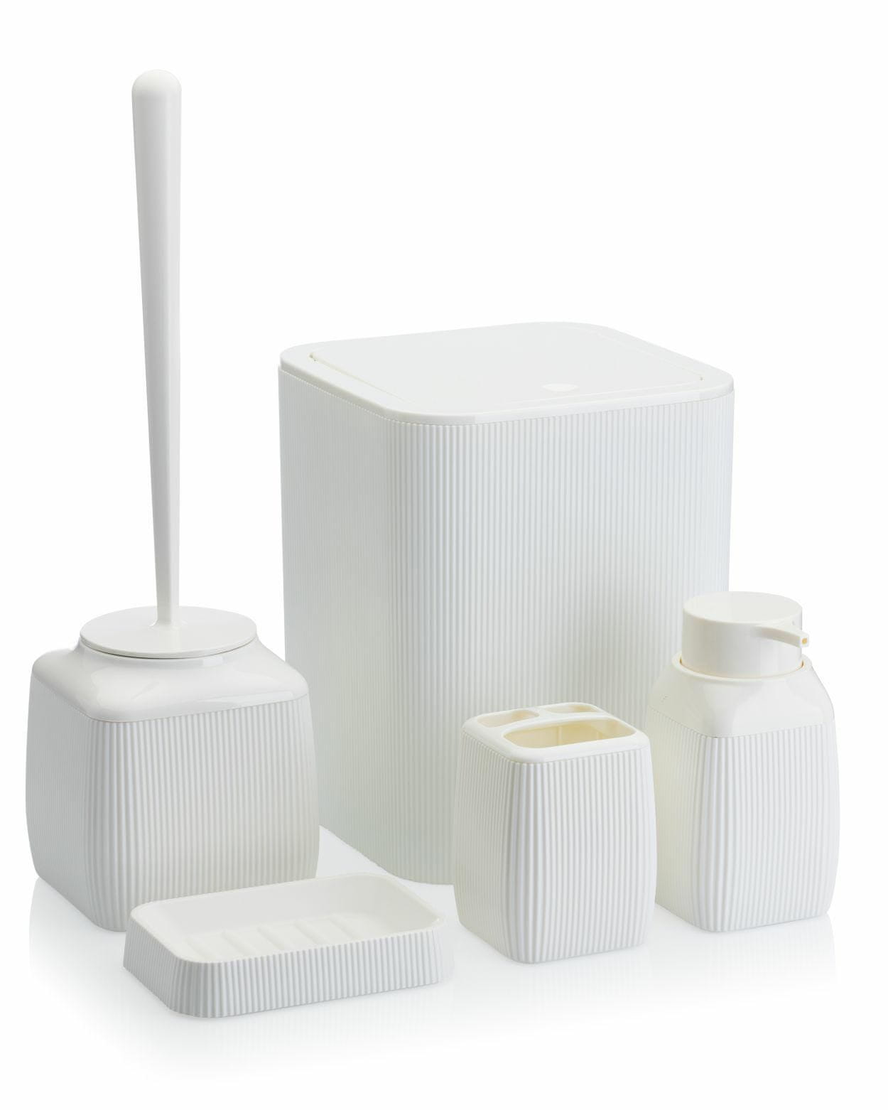 Kopalniški set „Crystal“ v elegantnem, modernem stilu je odlična rešitev za vsako kopalnico. Ta celovit komplet sestavlja pet funkcionalnih elementov, ki olajšajo organizacijo in dajejo kopalnici sodoben videz. Kopalniški set „Crystal“ združuje funkcionalnost, estetiko in skladnost v dizajnu. Klasična bela barva se poda številnim kopalniškim ureditvam. Je popolna rešitev za tiste, ki iščejo harmonijo v svoji kopalnici. Eleganten dizajn: Komplet „Crystal“ v beli barvi je kombinacija modernosti in naravne lepote. Kvadratne oblike dodajo minimalističen čar. Najvišja stopnja funkcionalnosti: Komplet vsebuje vse, kar potrebujete za urejenost vaše kopalnice – dozirnik za milo, stojalo za zobno ščetko, podstavek za milo, straniščno ščetko in eleganten koš za smeti. To je popoln komplet za vaše udobje. Materiali najvišje kakovosti: Komplet „Crystal“ je izdelan iz trpežnih materialov, zajamčeno