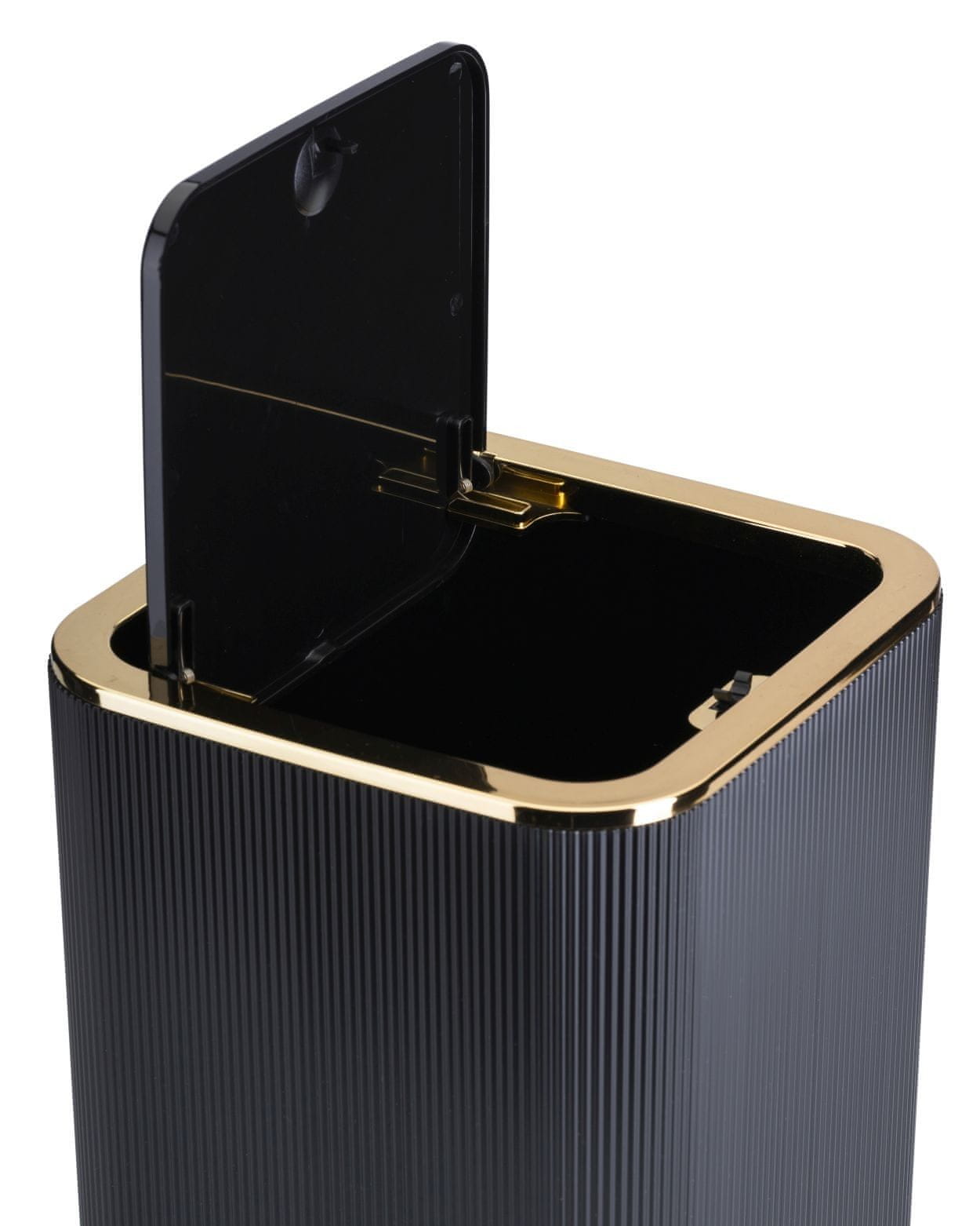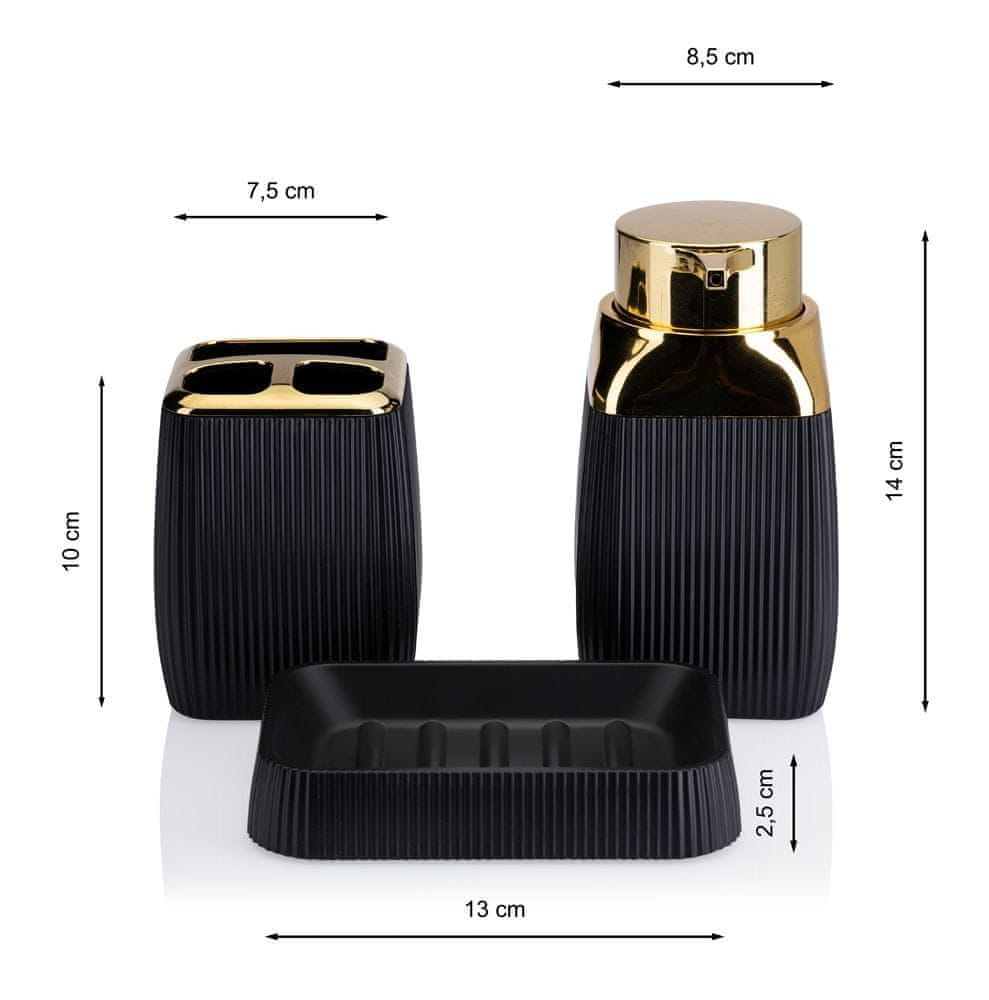 Kopalniški set „Crystal“ je s svojim elegantnim, modernim stilom odlična rešitev za vsako kopalnico. Ta obsežen komplet sestavlja pet funkcionalnih elementov, ki poenostavljajo organizacijo in dajejo kopalnici moderen videz. Kopalniški set „Crystal“ združuje funkcionalnost, estetiko in skladen dizajn. Črna barva dopolnjuje številne dizajne kopalnic, medtem ko zlati zaključek doda toplino in eleganco. Je popolna rešitev za tiste, ki iščejo harmonijo v svoji kopalnici. Eleganten dizajn: komplet „Crystal“ v črni barvi z zlatimi poudarki združuje sodobnost z elegantno lepoto. Kvadratne oblike dodajo minimalističen čar. Najvišja raven funkcionalnosti: Komplet vsebuje vse, kar potrebujete za urejenost vaše kopalnice – dozirnik za milo, stojalo za zobno ščetko, podstavek za milo, straniščno ščetko in eleganten koš za odpadke.